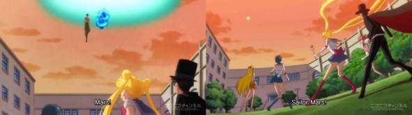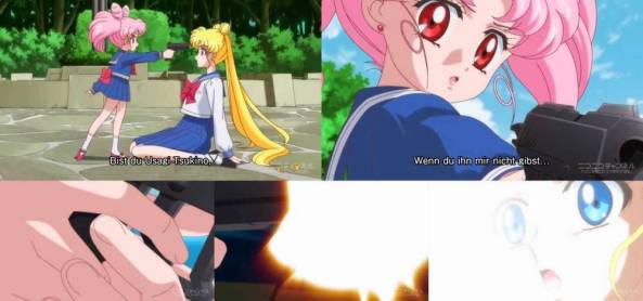 Die Handlung hingegen ist weitaus weniger zu bemängeln. Zwar gibt es für Kenner des Mangas und der alten Animationsserie nicht wirklich etwas Neues, aber gerade die Manga-Anhänger wird die Nähe zur Vorlage erneut sehr freuen. Chibiusas Auftauchen sorgt bereits in dieser ersten Folge (die wenigen Szenen aus der Letzten zähle ich da einfach mal nicht dazu) für Wirbel und es wird noch um einiges mehr werden. Schon alleine dieser Punkt sorgt für viel Spielraum, um spannende Geschichten zu erzählen. Und dann wäre da noch Black Moon. Hier zeigt sich sofort, dass es irgendeine Verbindung zum Silver Millenium und Sailor Moon zu geben scheint. Schon alleine durch den auf dem Kopf stehenden schwarzen Halbmond werden Verdachtsmomente gestreut.