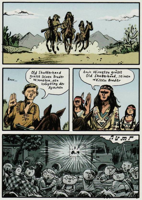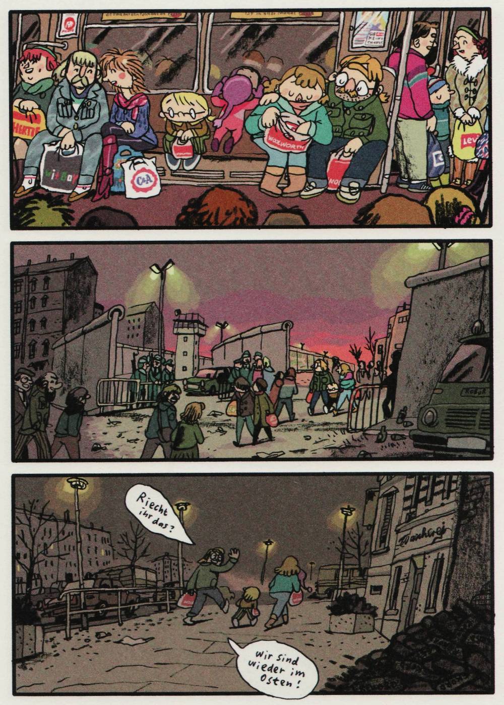Doch die mit dicken Outlines versehenen Bilder würden nur halb so gut funktionieren, wenn da nicht auch noch die außergewöhnlich gelungene Kolorierung wäre. Leider gibt es im Buch selbst keinen Hinweis darauf, ob hierfür ebenfalls Mawil verantwortlich ist, oder ob eine der vielen in der Danksagung am Schluss genannten Personen hierbei Hand angelegt hat. Die gesamte Farbgebung ist eher gedeckt gehalten, vorrangig in ruhigen Erdtönen. Selbst als es in den bunten und grellen „Westen“ Westberlins geht, werden die Farben nicht wirklich aufdringlich, sondern lediglich etwas heller und kräftiger, ohne dabei aus dem Gesamtkontext auszubrechen.