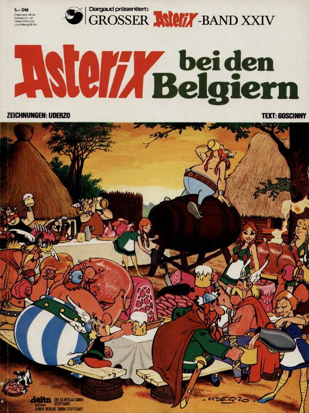 Nach den ganzen Begleitumständen zur Entstehung von „Asterix chez les Belges“ erschien das Abenteuer als Vorabdruck vom 17. April 1977 bis zum 19. Februar 1978 in den Ausgaben 4923 bis 4966 des Magazins Le Pèlerin, bevor Dargaud den kartonierten Band als letzte Ausgabe 1979 in den Handel bringt. In Deutschland wurde, nach der Einstellung der Heftserie MV Comix im Jahre 1977 dieses Abenteuer vorab in den Ausgaben 38 von 1978 bis Nummer 20 von 1979 der Fernsehzeitschrift GONG veröffentlicht. Noch während der Vorabdruck lief, wurde der Band am 19. Februar 1979 als „Grosser Asterix Band XXIV“ im Albumformat aufgelegt.
