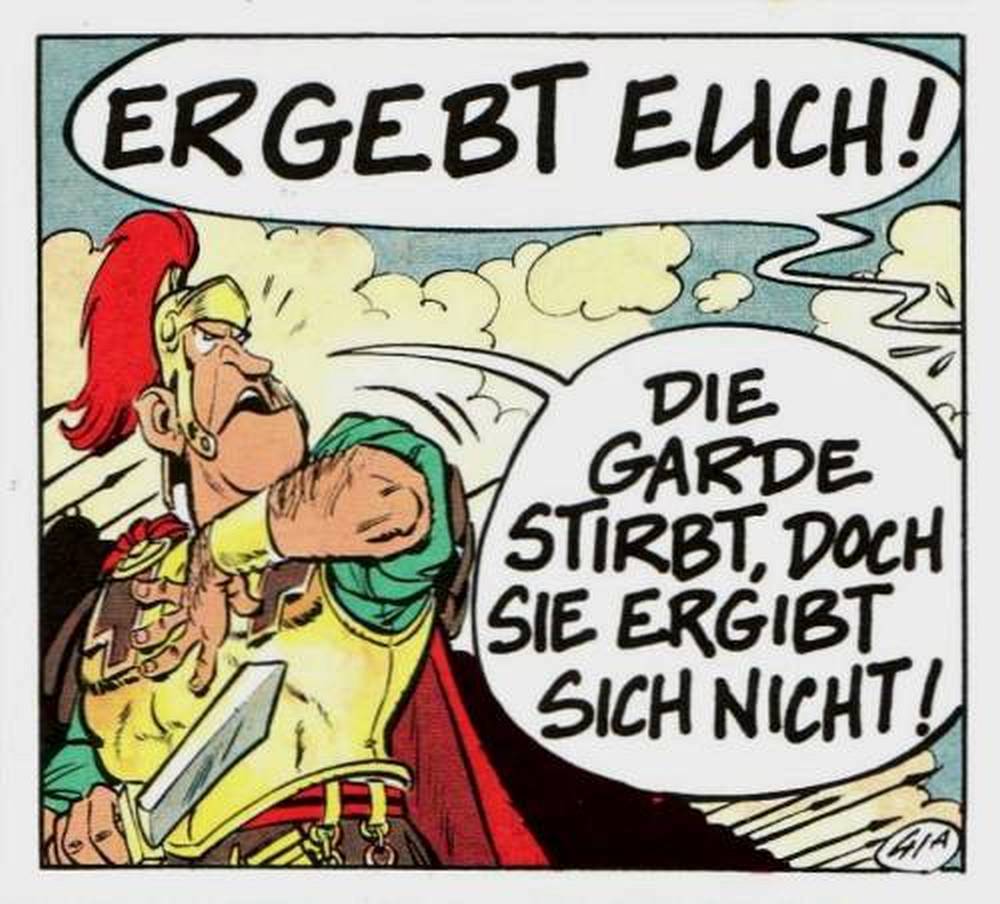 Selbst auf dem Abschlussbild findet sich eine kleine, aber durchaus ernste Widmung. Leicht versetzt über dem Schriftzug von Goscinny und Uderzo verewigt Albert Uderzo ein kleines trauerndes Kaninchen. Der Sinn und Zweck dahinter ist, dass „Le Lapaing“ (nach der südfranzösischen Aussprache von Lapin, was auf Deutsch Kaninchen bedeutet) der Kosename von René Goscinnys Frau Gilberte war.