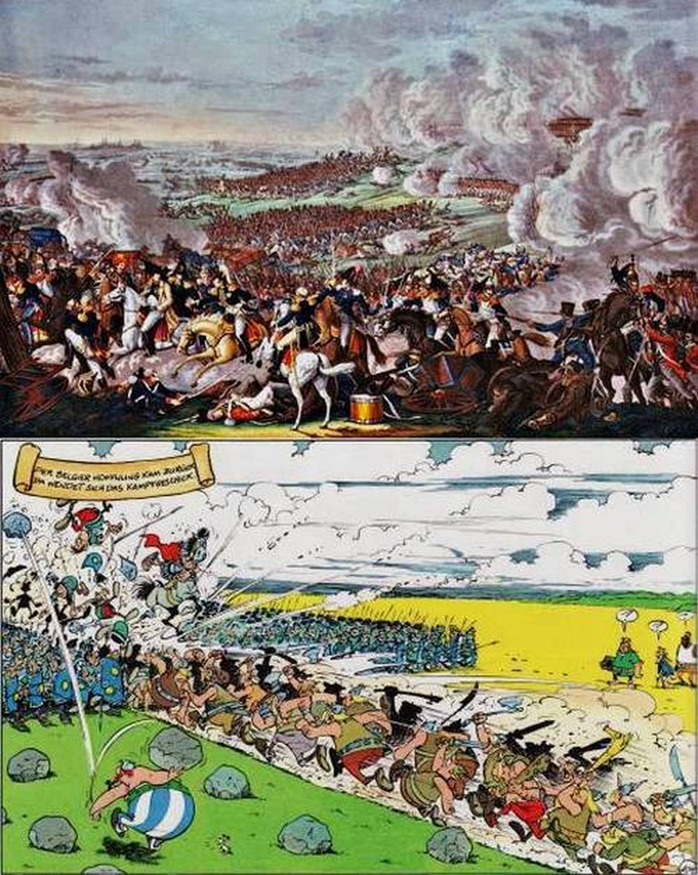 Doch auch die Schlacht der Belgier und Gallier gegen Cäsars römische Legion hat einen geschichtlichen Hintergrund. Goscinny lehnt diesen Kampf an die Schlacht von Waterloo am 18. Juni 1815 an, als Napoleon I. den britischen und preußischen Truppen unter der Führung der Feldmarschälle Wellington (auf britischer Seite) und Blücher (auf preußischer Seite) unterlag, was schlussendlich auch zu seiner Verbannung auf die Insel St. Helena führte. Ein weiterer Hinweis hierauf ist auch der Ausspruch von Cäsars Truppenführer: „Die Garde stirbt, doch sie ergibt sich nicht!“ Mit diesem Ausspruch soll angeblich der französische General Pierre Cambronne die Aufforderung zur Kapitulation abgelehnt haben.