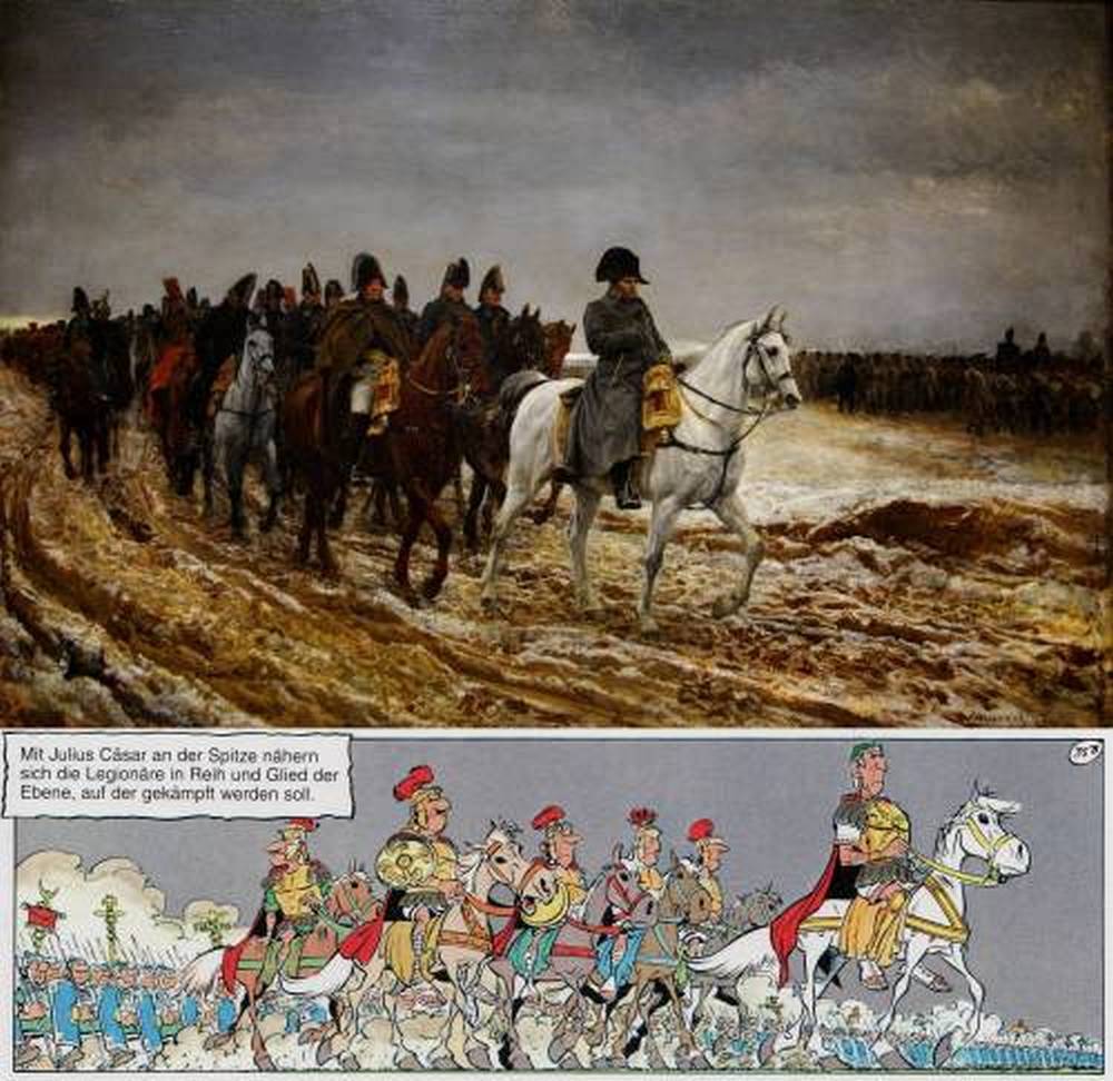 Aber auch von bekannten Kunstwerken hat sich Uderzo inspirieren lassen. Neben dem in der Einleitung bereits erwähnten Gemälde „Die Bauernhochzeit“ von Pieter Bruegel hat es Uderzo auch Jean Louis Ernest Meissoniers Bild „Campagne de France“ angetan, welches den Rückzug Napoleons nach Paris zeigt.