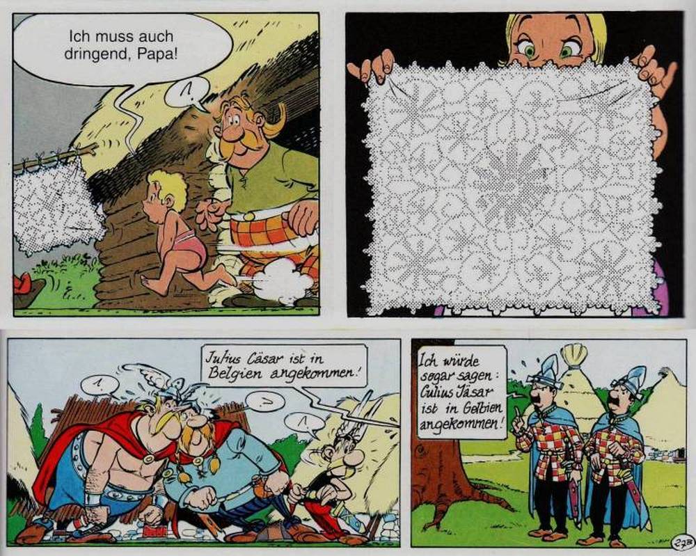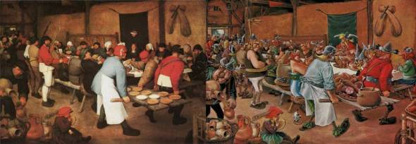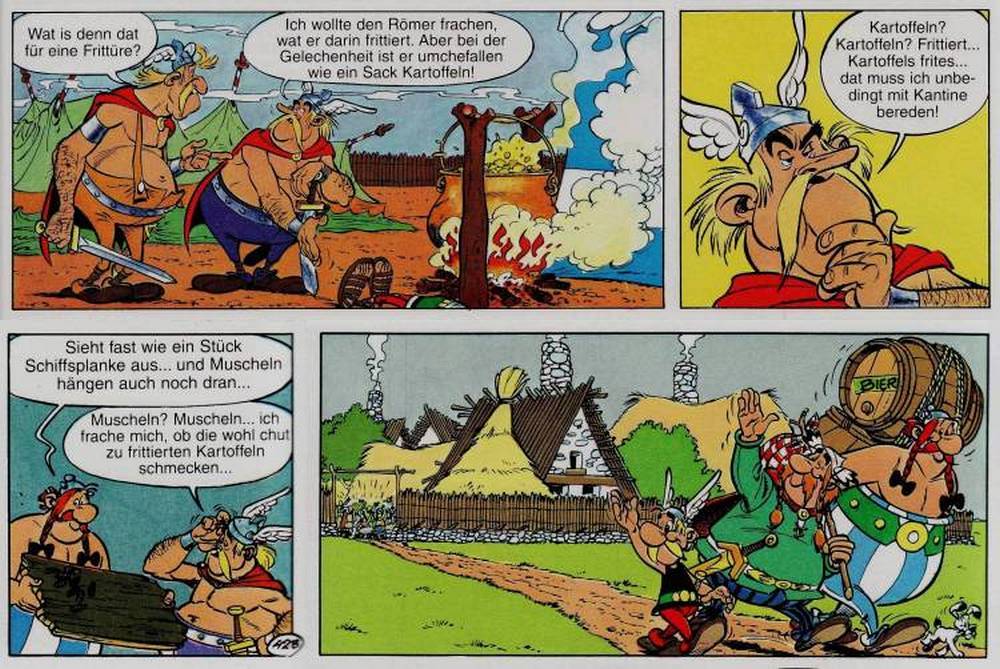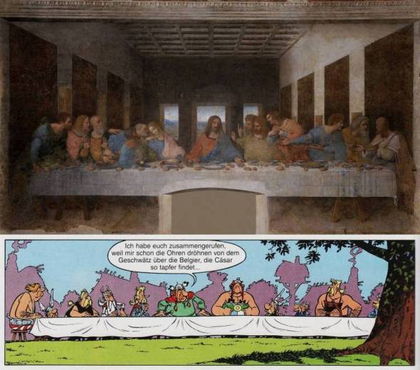 Zum Anderen wäre da der Maler Pieter Bruegel der Ältere, von dessen Kunstwerk der „Bauernhochzeit“ sich Uderzo für sein „Gemälde“ auf der vorletzten Seite des Abenteuers inspirieren ließ.