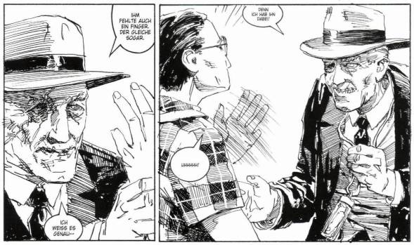 Um dies visuell entsprechend umzusetzen, wurde Vince Locke als Zeichner ausgewählt. Wie auch schon bei „From Hell“, von Alan Moore und Eddie Campbell, gibt es bei „A History of Violence“ keinerlei Farben oder Grauabstufungen. Alle Ereignisse werden in minimalistischem Scharz und Weiß dargebracht. Wer jetzt allerdings glaubt, dass hierdurch Elemente verloren gehen könnten, den kann ich beruhigen. Gerade wegen der auf die notwendigsten Dinge beschränkten Stilmittel erzeugt Vince Locke eine sehr überzeugende und spürbar dichte Erzählweise. Auch die bereits angesprochenen Grausamkeiten werden in ihrem Detailreichtum in keinster Weise eingeschränkt, was manchmal sehr erschreckend ist.