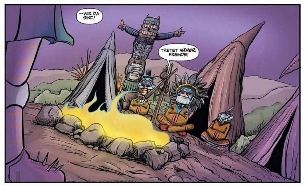 Inhaltlich setzt die dritte Ausgabe genau da an, wo die Letzte endete. Und das ist auch sehr gut so. Denn der Cliffhanger war schon übel. Was mir als Erstes auffällt, ist eine gewisse Ähnlichkeit mit „Zurück in die Zukunft 3“. Denn auch dort findet sich „Doc“ Emmet Brown im Wilden Westen wieder. Allerdings gibt es dort keine Roboter. Dieses Feature erinnert wieder an Wild Wild West (sowohl die Verfilmung mit Will Smith und Kevin Kline als auch die ursprüngliche TV-Serie aus der zweiten Hälfte der 60er Jahre). Aber auch Ähnlichkeiten zu Westworld sind zu finden, gerade die Roboterthematik, wenngleich sie hier trotzdem komplett anders ausfällt. Am augenscheinlichsten sind aber wohl die Anlehnung an die Animationsserien „ Saber Rider and the Star Sherrifs“, „Galaxy Rangers“ und „Brave Starr“ die in den 90er Jahren über viele Bildschirme in den Kinderzimmern flimmerten.