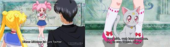 Vor den letzten beiden Sailor Kriegerinnen und Tuxedo Mask steht plötzlich King Endymion, oder besser gesagt dessen Geistform. Er offenbart ihnen, was zu all dem Unglück im 30. Jahrhundert führte und stellt sich auch noch als das zukünftige Ich von Tuxedo Mask, Mamoru, heraus. Aber das ist noch nicht alles. Endymion lüftet das Geheimnis um Chibiusa und stellt sie ihnen als die gemeinsame Tochter von Usagi und Mamoru vor, während Chibisusas Kätzchen Diana, die Tochter von Luna und Artemis ist. So viele Informationen auf einmal sorgen dafür, dass Sailor Moon und Tuxedo Mask übersehen, dass zwei gleiche Geschöpfe nicht innerhalb einer Zeit existieren dürfen, weil es sonst zu Spannungen kommt. Daher bleibt ihnen nichts anderes übrig, als in die Vergangenheit zurückzukehren. Doch Chibiusa kann sich nur schwer von ihren Eltern trennen und reist wieder in die Zukunft, ohne zu wissen, dass sie damit ihr Leben riskiert …