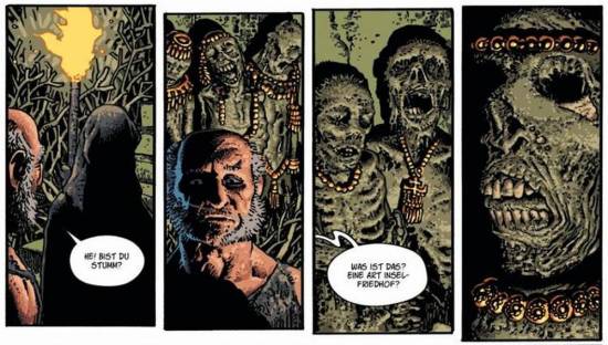 Gemeinsam mit seiner Frau Beth Corben Reed, welche für die Farbgebung verantwortlich ist, schafft er es Poes Erzählungen nicht einfach nur wiederzugeben, sondern ihnen auch eine dazu passende melancholisch düstere Ebene hinzuzufügen, was Poes Werke noch ein Stück weit furchteinflößender macht. Einzig mit seinen Gesichtern habe ich gelegentlich Probleme. Denn Corben ist nicht nur ein Freund von großen Brüsten und leicht molligen Damen, sondern auch von sehr dominanten Nasen, welche die Gesichter seiner Figuren schmücken. So kommt es gelegentlich zu unfreiwillig komischen Momenten, wohingegen andere „deformierte“ Körperteile eher einen gewollten Gänsehautfaktor besitzen. Grundsätzlich hat Corben auch keinerlei Skrupel vor expliziten Darstellungen. Sei es nackte Haut (besonders bei den Damen), wie auch Gewalt oder die Überreste von bereits Verstorbenen. Dem Gegenüber, stehen dann wiederum wundervolle Landschaftsbilder, die aus einem Bildband stammen könnten und eher träumerisch als bedrohlich wirken.