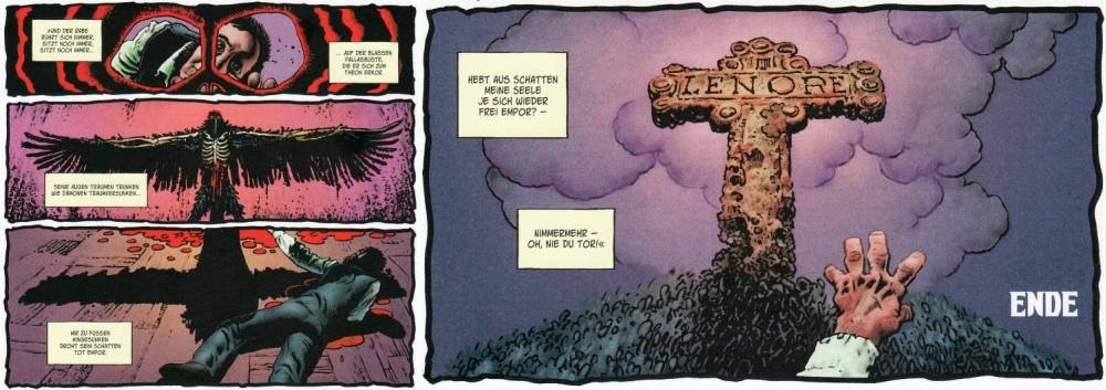 Poe und Corben in einem Band. Was kann es Besseres geben? Nicht viel ehrlich gesagt und trotzdem sollte man bei der Lektüre des Bandes vorsichtig sein. Denn Poe wirkt nach und mit den Bildern von Corben erst recht. Daher ist meine Empfehlung auch, den Band in feinen Dosen zu konsumieren. Die Geschichten können dadurch ihre Wirkung besser entfalten. Außerdem sollt eman sich die Zeit nehmen und sich mit den einzelnen Erzählungen etwas ausführlicher auseinandersetzen. Denn es gibt weitaus mehr in den Umsetzungen zu entdecken, als es oberflächlich gesehen den Anschein hat.