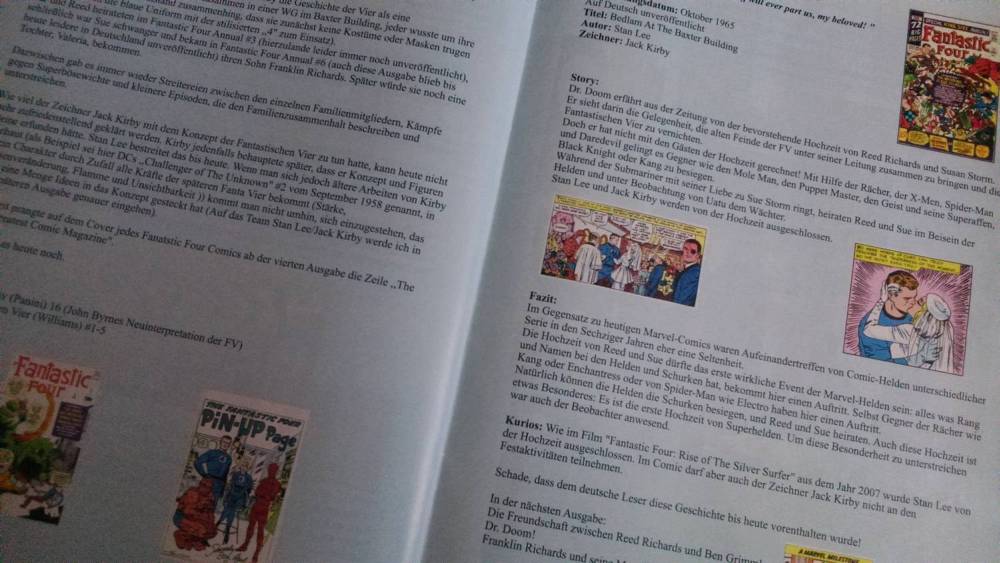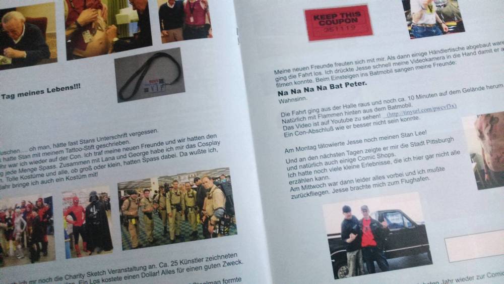 Weiter geht es mit dem Thema Comic Conventions. Hier zeigt Peter nicht nur Abbildungen der ersten beiden Con-Magazine (aus den Jahren 75 und 76) sondern bringt auch einen zweiseitigen Comic zum Abdruck, der Spider-Man auf einer solchen Convention zeigt. Danach erzählt er von seinem ersten Con-Besuch 2012, bei dem er unter anderem auch Stan Lee, den Erfinder vieler Marvel-Superhelden, persönlich traf, ein Foto mit ihm machen und sich sogar dessen Unterschrift auf den Bauch tätowieren lies, nachdem dieser dort unterzeichnete. So skurril und fantastisch, wie es klingt, wird es auch im zugehörigen Artikel von Peter beschreiben und mit Fotos belegt. Außerdem gibt es noch einen interessanten Blick auf George Barris, einen Autobastler, der unter anderem das Batmobile für die Batman TV-Serie mit Adam West schuf und so bekannte Fahrzeuge wie KITT für Knight-Rider, oder Drag-U-La und Monster Koach für die Munsters TV-Serie. Des Weiteren widmet sich Peter dem Aufstieg der PEZ-Spender und den ersten Spider-Man Spin-Off-Comicserien, überlässt dann aber auch noch seinem guten Freund Alexander Meyer einen sehr schönen und ausführlichen Artikel über die Entstehung der Fantastic Four, Marvels First Family, der allerdings nur den ersten Teil einer längeren Artikelserie darstellt.