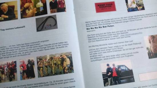 Bei diesem Heft, mit immerhin 28 Seiten Umfang die auch noch komplett farbig sind, handelt es sich ausschließlich um ein reines Fanmagazin, welches auf 100 Ausgaben limitiert ist. Neben einem sehr schönen Motiv von Zeichner Stefan Sombetzki, dass Peter als Kraven zeigt (nebenbei bemerkt ein Kostüm, welches er zur letztjährigen ComicCon in Pittsburgh trug), zeigt die Vorderseite vier weitere Zeichnungen von Peter und seiner Frau Heike in verschiedenen Comicrollen, die aber von Craig Boldman zu Papier gebracht wurden. Auch die Rückseite des Heftes, das Backcover sozusagen, ist mit einem Boldman-Bild versehen, welches erneut Peter mit seiner Frau zeigt. Hier befindet sich unten rechts auch die Limitierungshöhe, sowie die handschriftliche Nummer, welche Ausgabe man selbst besitzt. Ebenfalls handschriftlich nummeriert ist ein beiliegendes Kärtchen, mit einem Motiv von Terry Stewart, der eine zeitlang für Marvel arbeitete. Hier sieht man sein Konterfei mit Kaugummiblase, was von einem Stempel stammt, mit dem er mutmaßlich seine beantwortete Fanpost abstempelte. Doch dazu gleich mehr.