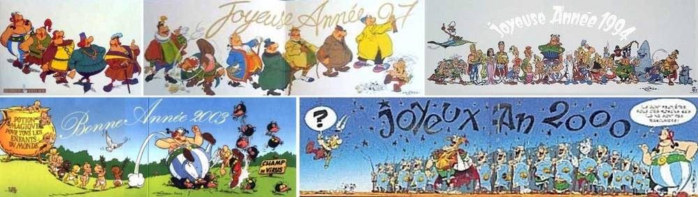 Die darauf folgenden Kostümentwürfe, allesamt entworfen von Madame Methusalix, stammen ursprünglich von einer Neujahrsglückwunschkarte aus dem Jahr 1996 der Edition Albert Rene. Die darauf verwendete Kurzgeschichte wurde bereits ab der dritten Auflage von „Asterix plaudert aus der Schule“ veröffentlicht. Die Rede ist von „Obelix als ABC-Schütze“. Auf Seite 16, findet sich in der zweiten reihe gleich im ersten Panel ein Bild, welches so manch einem vielleicht bekannt vorkommt. Es stammt ursprünglich aus einem Bild, welches die Evolution Asterix‘ darstellt und stammt eigentlich aus dem Jahr 1994 und dem „Le Journal exceptionnel d’Astérix“. Dann folgen drei Bilder eines grübelnden und intellektuellen Asterix, welche von einer Glückwunschkarte aus dem Jahr 1999 stammen, mit der der Verlag seinen Geschäftspartnern zum neuen Jahr 2000 gratuliert. Die nächste Seite zeigt Abbildungen von sogenannten Model Sheets für das Studio Idefix, anhand derer die Animationszeichner ihre Arbeiten überprüfen konnten.