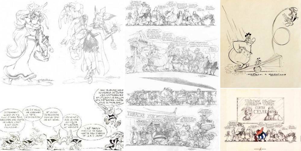 Es folgen Zeichnungen, welche bereits kurz zuvor im Skizzenband zu „Asterix und Latraviata“ erschienen sind, sowie eine Abwandlung des Motivs mit Goscinnyrix und Uderzorix, das in der ersten Auflage des Bandes „Asterix und Maestria“ anstelle der Vorstellung der wichtigen Gallier, in Deutschland erschien, aber wie im Review dort beschrieben auch bereits etwas älter ist. Dem folgen erneut Promobilder, die im Jahr 1999 anlässlich des Realfilmes „Asterix und Obelix gegen Cäsar“ entstanden. Wo diese damals jedoch veröffentlicht wurden, ist bisher unbekannt. Auch ein erneut früher erschienenes Pilote Titelbild kommt wieder zum Einsatz, wobei es sich hier um eine Collage handelt, bei der auch der Entwurf für das Titelbild zu „La Rose et le Glaive“ („Asterix und Maestria“) verwendet wurde.