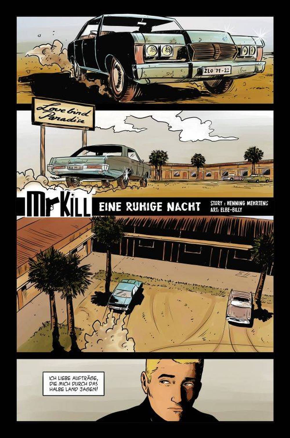 Schon in „Gestatten, Mr. Kill“ war Elbe Billy mit einem Beitrag vertreten, und auch dieses Mal, darf er für Mr. Kill ein neues Abenteuer bebildern. Komplett in Farbe und im Stile einer Mischung aus Crime-Thriller und Roadmovie, verschlagt es Mr. Kill in eines der typisch amerikanischen Motels, wie sie auf den langen Highways überall zu finden sind. Dort gerät in einen Streit zwischen einer Dame und dessen gewalttätigen Begleiter. Doch Mr. Kill findet dessen verhalten alles andere als angemessen, kann aber, ohne einen Auftrag, nichts unternehmen. Oder vielleicht doch …?