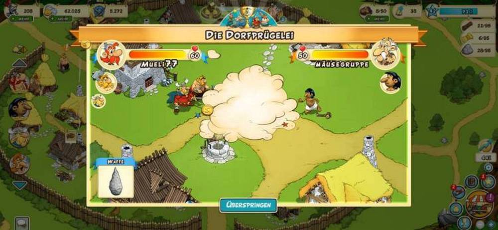 Damit man aber nicht immer nur alleine spielt, (ab-)baut und levelt, auch wenn man mit dem seit geraumer Zeit verfügbaren erweiterten Gebiet von Ägypten und dem dort zu errichtenden Palast durchaus schon ausgelastet sein könnte, gibt es noch die sogenannten Dorfprügeleien, bei denen man sich mit anderen Spielern messen kann. Hier tritt die eigene Dorfmannschaft gegen die anderer Dörfer (wahlweise Freunde oder zufällig ausgewählte Gegner) an. Als Wetteinsatz können benötigte Ressourcen gewählt werden, und auch die Schlagkraft der eigenen Mannschaft kann mit eigens dafür hergestellten Waffen und Tränken verbessert werden. Allerdings sollte ich erwähnen, dass diese Prügeleien nicht in Echtzeit ablaufen. Man misst sich mit anderen Spielern, bzw. deren Truppen und diese bekommen nachträglich den Verlauf mitgeteilt und können bei erfolglosem Kampf eine Revanche anstreben.