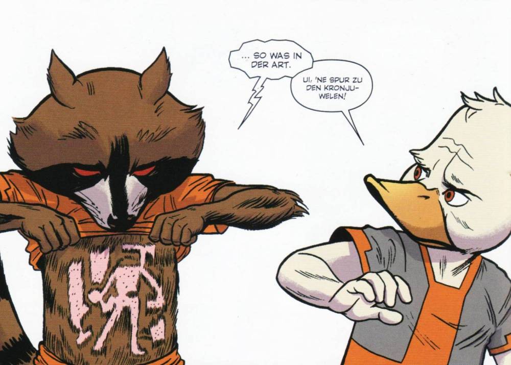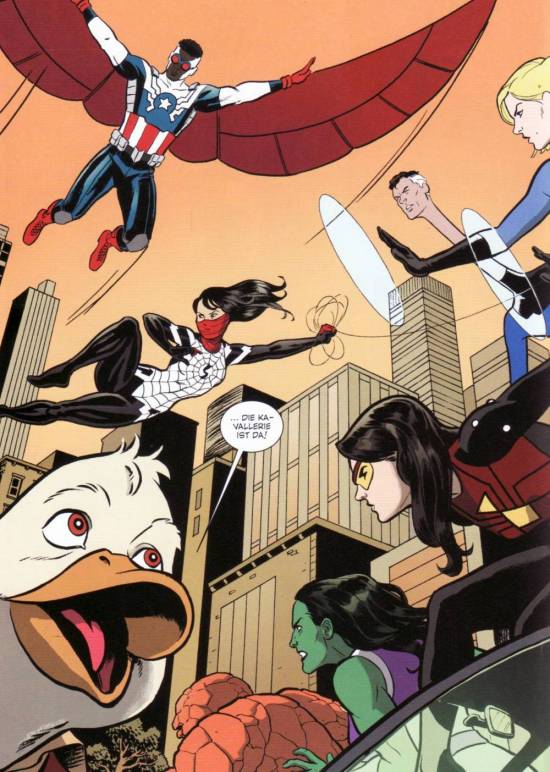 Genauso verrückt, wie Gerber mit seinem Erpel umgesprungen ist, macht es jetzt auch Chip Zdarsky und schickt Howard in ein aberwitziges Abenteuer mit einer ganzen Riege an Gaststars. Sei es She-Hulk, Jennifer Walters, die sich als Howards Anwältin entpuppt, Spider-Man, der als weinerlicher Pseudo-Held Howard helfen soll, Rocket Raccoon mit dem Howard Seite an Seite gegen die Schergen des Collectors kämpft, Dr. Strange oder den gesamten Fantastic Four und den Avengers. Dennoch muss ich anmerken, dass Zdarsky seine Arbeit zwar sehr gut macht, aber an Steve Gerber einfach noch nicht heran kommt. Dennoch schafft er es Howard gekonnt in Szene zu setzen, ihn sowohl einfühlsam, als auch zynisch, sarkastisch und einfach nur nervtötend darzustellen, dass man trotz all seiner Macken den verrückten Enterich einfach gerne haben muss. Hinzu kommen viele Querverweise, die mal auf bereits erschienene Abenteuer hinweisen und dann wieder komplett frei erfunden sind, aber dennoch echt wirken sollen. Auch wenn diese nur einem echten Kenner des Marvel-Universums auffallen.