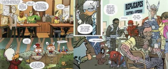 Die Zeichnungen zur Hauptgeschichte stammen in diesem Band von Joe Quinones. Aber es gibt noch ein paar Kurzgeschichten, die von Rob Guillory, Jason Latour, Katie Cook bebildert wurden. Während Letztere durch sehr schräge Zeichenstile auffallen, wirken Quinones Bilder, gemessen an der doch sehr schrägen Geschichte und den Figuren, etwas „realistischer“. In gewissen Einstellungen erinnert mich sein Howard sogar an die, für meinen Geschmack, zu Unrecht verrissene Verfilmung von George Lucas. Denn auch wenn dieser Howard recht wenig mit Gerbers Ursprungsversion gemeinsam hatte, gibt es gewisse optische Ähnlichkeiten, die sich einfach nicht verleugnen lassen. Doch das ist es nicht alleine, was mich bereits beim ersten Durchblättern angesprochen hatte. Die gesamte Bildkomposition, die vielen kleinen visuellen Gags und auch der sehr hohe Wiedererkennungswert konnten mich sofort überzeugen, und das, obwohl mir Joe Quinone kein bewusster Zeichner ist. Sprich, ich kann ihm auf Anhieb keine Arbeiten zuweisen, an die ich mich erinnern würde, was eigentlich kein gutes Zeichen bei mir ist. Denn egal, wie gut oder schlecht ein Zeichner ist, wenn er außergewöhnlich genug ist, sein Stil sich von anderen abhebt, dann merke ich ihn mir. Quinones ist dies in meinem Fall erst mit dieser Serie gelungen.