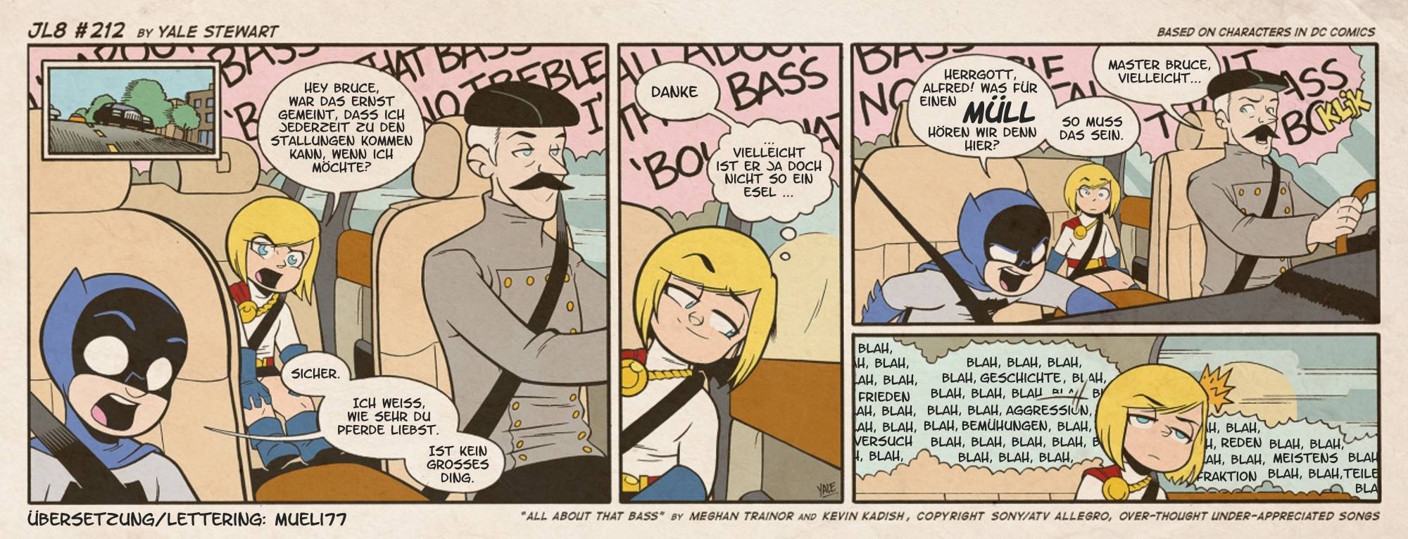 Mär 24 2016 JL8 Episode #212 … Karen mit Bruce aber auch nicht! 😀 Viel Spaß damit! (für eine größere Ansicht auf das Bild klicken) Characters © DC Comics, Creative Content © Yale Stewart. (Fortsetzung folgt…) JL8 im Web: Tumblr, Facebook, Twitter © 2016 Copyright der Übersetzung by „Mueli77’s Feine Welt“. Jegliche Weiterverwendung ohne ausdrückliche Genehmigung untersagt. Bewerten:Teilen: Klicken, um auf WhatsApp zu teilen (Wird in neuem Fenster geöffnet) WhatsApp Tweet Klicken, um einem Freund einen Link per E-Mail zu senden (Wird in neuem Fenster geöffnet) E-Mail Klicken zum Ausdrucken (Wird in neuem Fenster geöffnet) Drucken Auf Tumblr teilen Klick, um auf Reddit zu teilen (Wird in neuem Fenster geöffnet) Reddit Klicken, um auf Telegram zu teilen (Wird in neuem Fenster geöffnet) Telegram Pocket Zum Teilen auf Mastodon klicken (Wird in neuem Fenster geöffnet) Mastodon Zum Teilen auf Nextdoor hier klicken (Wird in neuem Fenster geöffnet) Nextdoor Gefällt mir Wird geladen … Ähnliche Beiträge