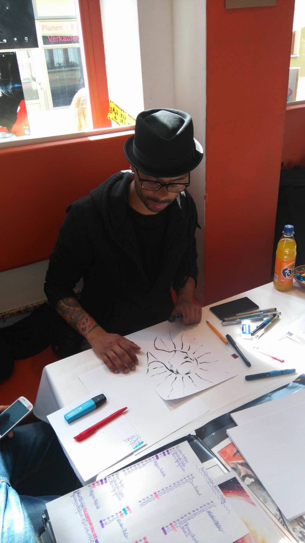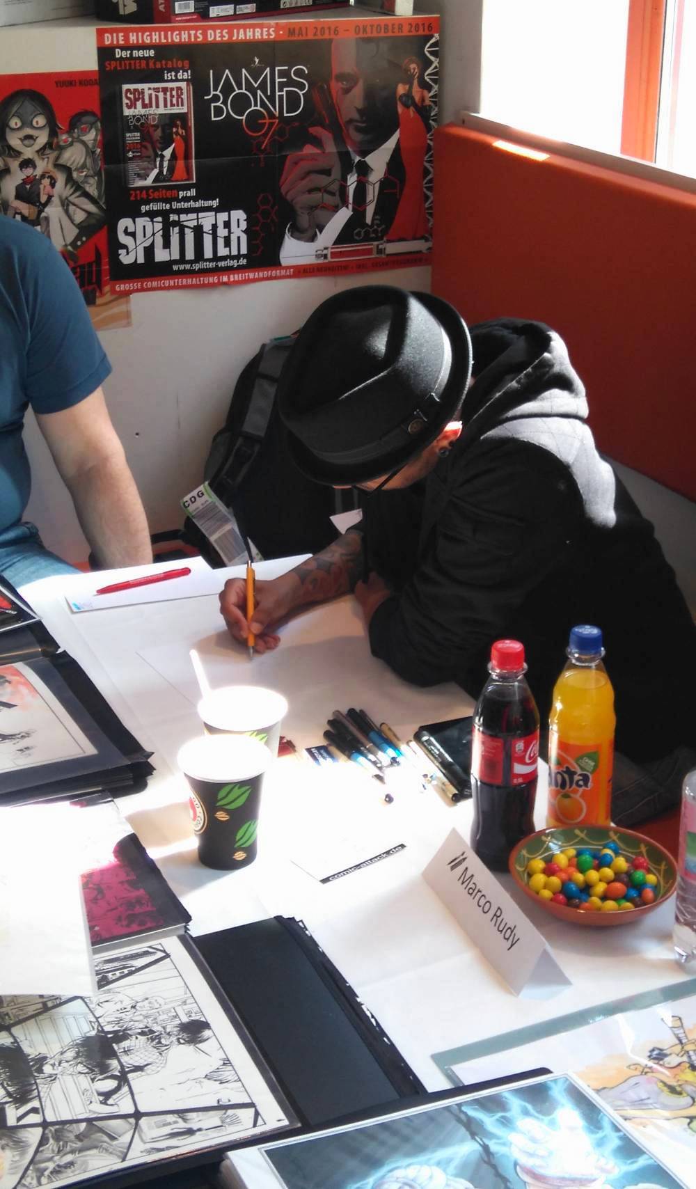 Marco Rudy zeigte sich als sehr freundlicher Zeichner, der auch mit Fans ins Gespräch kam, fachsimpelte und scherzte. Sketch-Wünsch nahm er, bis auf Swamp Thing (oder Marvels Pendant Man-Thing) gerne an, wobei er sich auch gleich über die vielen verschiedenen „Kopien“ von Superman ausließ. In diesem heutigen Fotospecial möchte ich euch einen kleinen Einblick in die Signierstunde geben und meine Errungenschaften, sowie die meiner Kinder vorstellen …