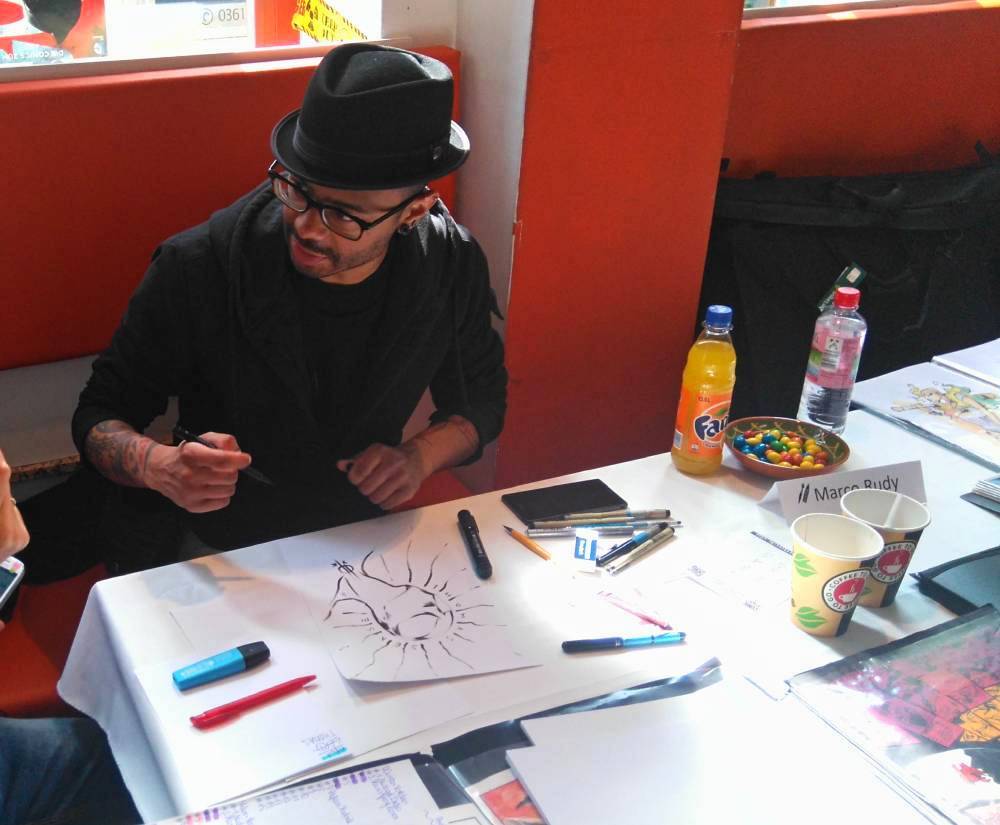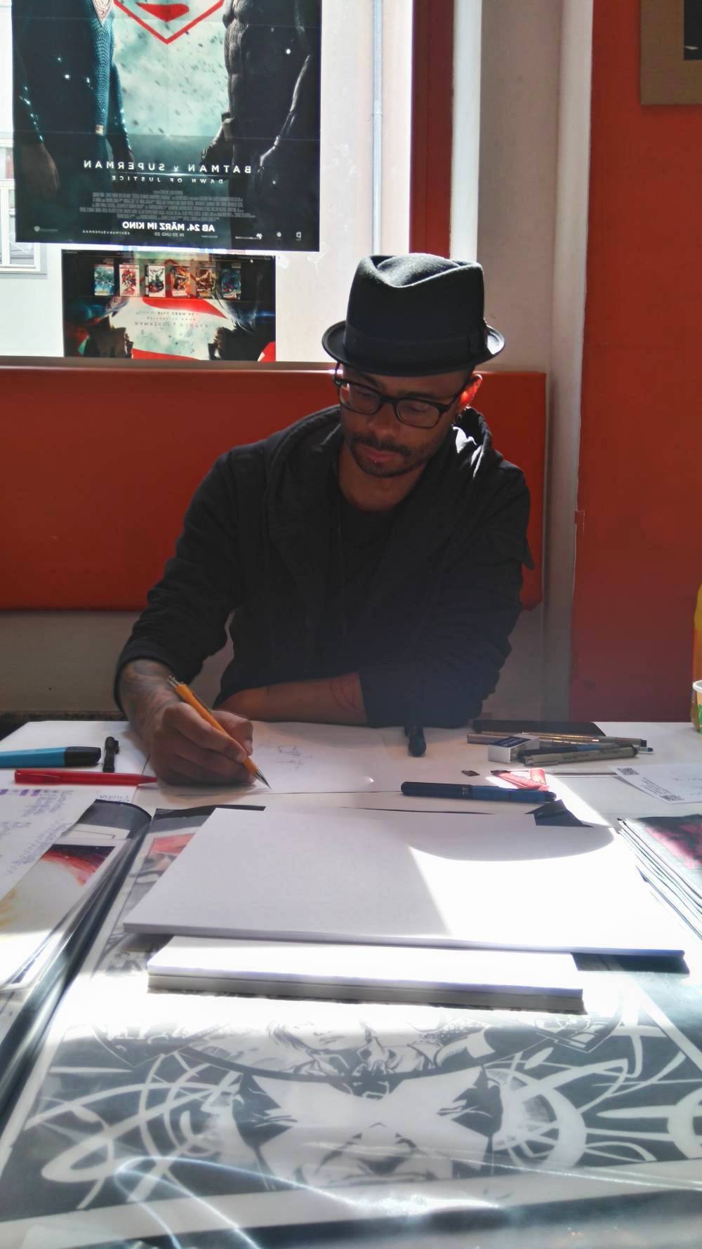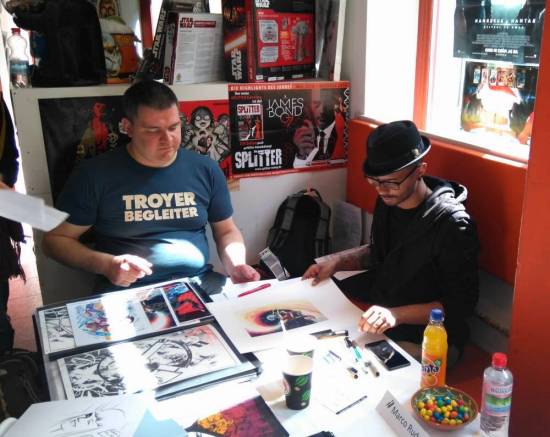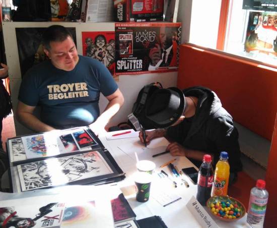 Heute fand in Erfurt, in meinem Stammcomicshop, dem Comic Attack in Erfurt, eine Signierstunde mit dem kanadischen Comiczeichner Marco Rudy statt. Ursprünglich stammt Rudy aus Südafrika, wanderte dann aber über Brasilien nach Kanada aus. Bisher hat er für DC unter anderm an „Swamp Thing“ (auch hier auf dem Blog in Reviews), „Superman“, „Final Crisis“ und „The Shield“ gearbeitet. Für Marvel zeichnete er zuletzt „Marvel Knights: Spider-Man“ (ebenfalls im Review hier auf dem Blog), „Winter Soldier“, „Uncanny X-Men“ und „Scarlet Witch“.