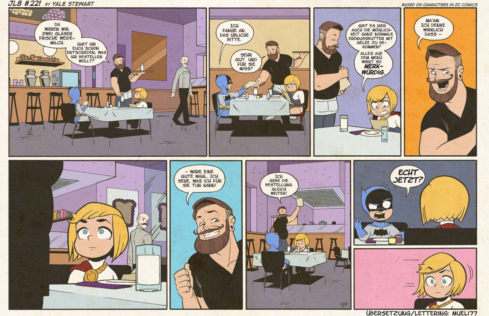 Jun 23 2016 JL8 Episode #221 Auch heute gibt es wieder eine nagelneue Episode und so langsam entwickelt sich Bruce zu einem echten Arschloch … Viel Spaß damit! (für eine größere Ansicht auf das Bild klicken) Characters © DC Comics, Creative Content © Yale Stewart. (Fortsetzung folgt…) JL8 im Web: Tumblr, Facebook, Twitter © 2016 Copyright der Übersetzung by „Mueli77’s Feine Welt“. Jegliche Weiterverwendung ohne ausdrückliche Genehmigung untersagt. Bewerten:Teilen: Auf WhatsApp teilen (Wird in neuem Fenster geöffnet) WhatsApp Tweet Einen Link per E-Mail an einen Freund senden (Wird in neuem Fenster geöffnet) E-Mail Drucken (Wird in neuem Fenster geöffnet) Drucken Auf Tumblr teilen Auf Reddit teilen (Wird in neuem Fenster geöffnet) Reddit Auf Telegram teilen (Wird in neuem Fenster geöffnet) Telegram Pocket Auf Mastodon teilen (Wird in neuem Fenster geöffnet) Mastodon Auf Nextdoor teilen (Wird in neuem Fenster geöffnet) Nextdoor Gefällt mir Wird geladen … Ähnliche Beiträge