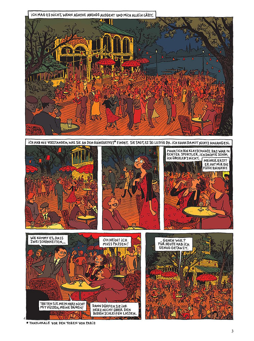 Schlägt man die ersten Seiten auf, so ziehen einen die Zeichnungen, die Farben, die Bilder direkt nach Paris in die 30er Jahre hinein.