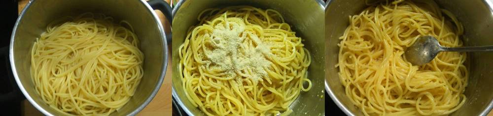 Sind die Nudeln gut, wird das komplette Wasser abgegossen. Zu den jetzt noch heißen Nudeln gebt ihr dann die Butter die 2 Eier und den geriebenen Parmesan. Jetzt alles schön vorsichtig mit einem Löffel durchmischen, sodass eine schöne Masse entsteht.