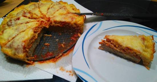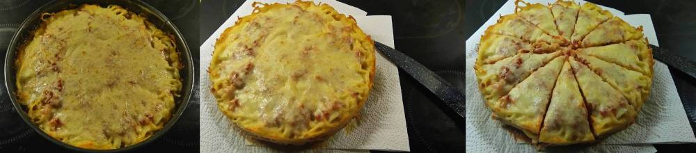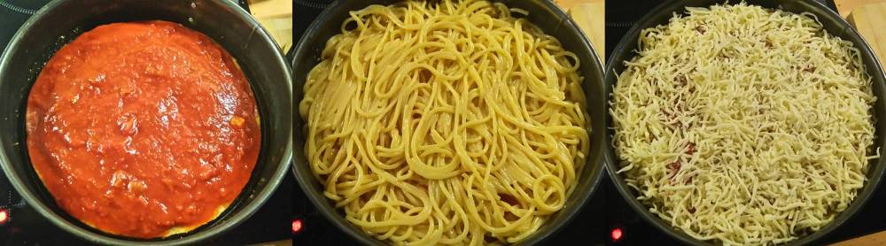 Inzwischen ist vielleicht auch schon die Zeit für den Boden um. Nehmt ihn nach den 30 Minuten aus dem Ofen und stellt ihn auf eine hitzbeständige Unterlage. Vorher eventuell noch ausgetretene Flüssigkeit (Fett, usw.) abgießen. Auf dem jetzt etwas kleineren Boden (er müsste rundherum knapp einen Zentimeter „verloren“ haben) verteilt ihr die erste Hälfte der Tomatensauce (oder wahlweise nach persönlichem Geschmack abgewürzten stückigen Tomaten, oder auch selbst gemachte Tomatensauce). Richtig schön gleichmäßig verteilen und darauf die erste Hälfte des geriebenen Käses streuen. Dann gebt ihr die Nudelmasse darauf, auf der ihr dann die restliche Tomatensauce verteilt, genauso, wie den restlichen geriebenen Käse.