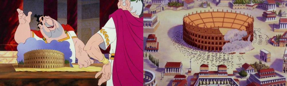 Ganz zu schweigen von den kleinen Dingen, die diesen Film so unterhaltsam machen. Obelix, der das Colosseum zerstört, und die Parodie auf das Wagenrennen, wie es auch bei Ben Hur stattfand.