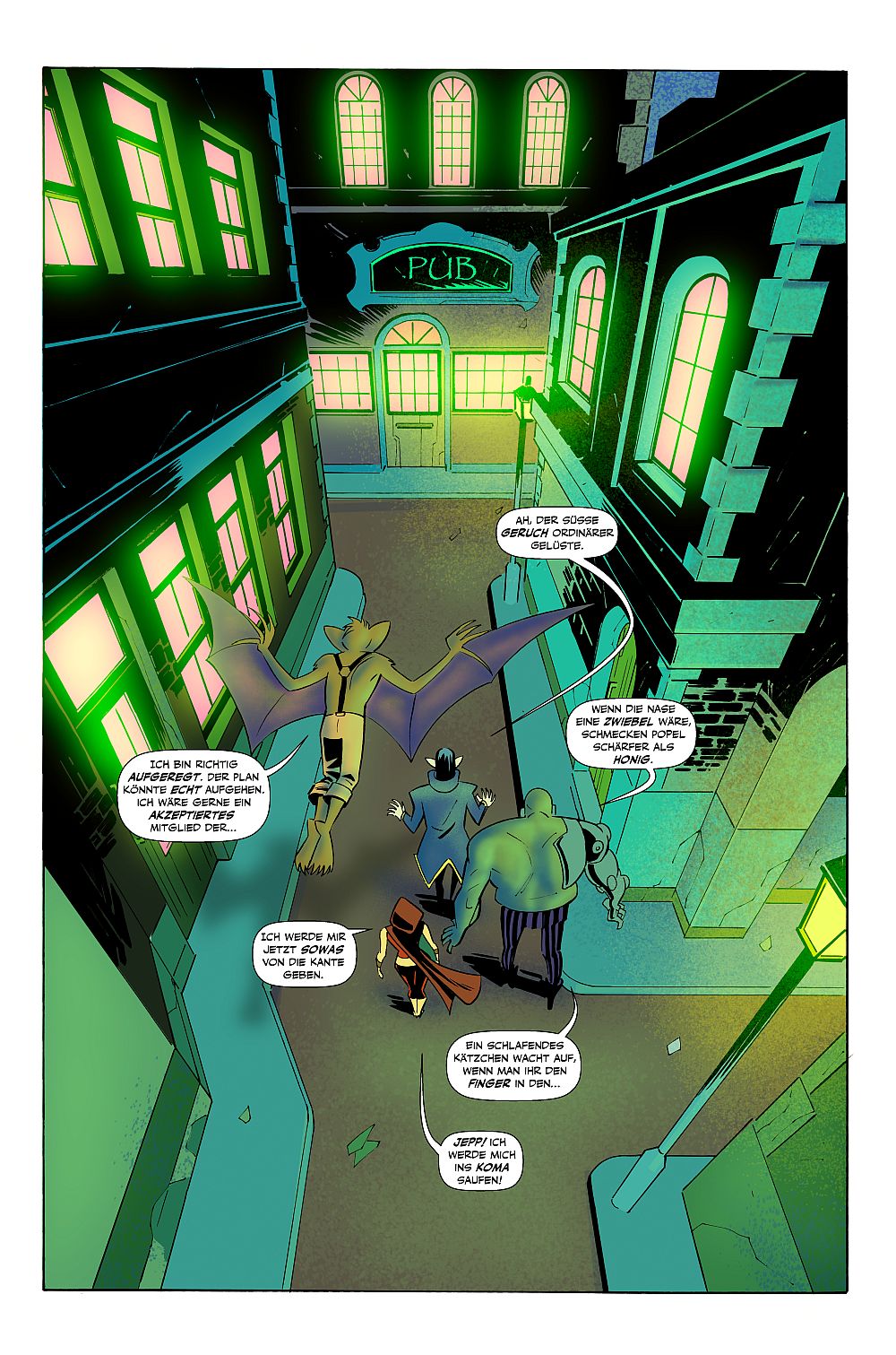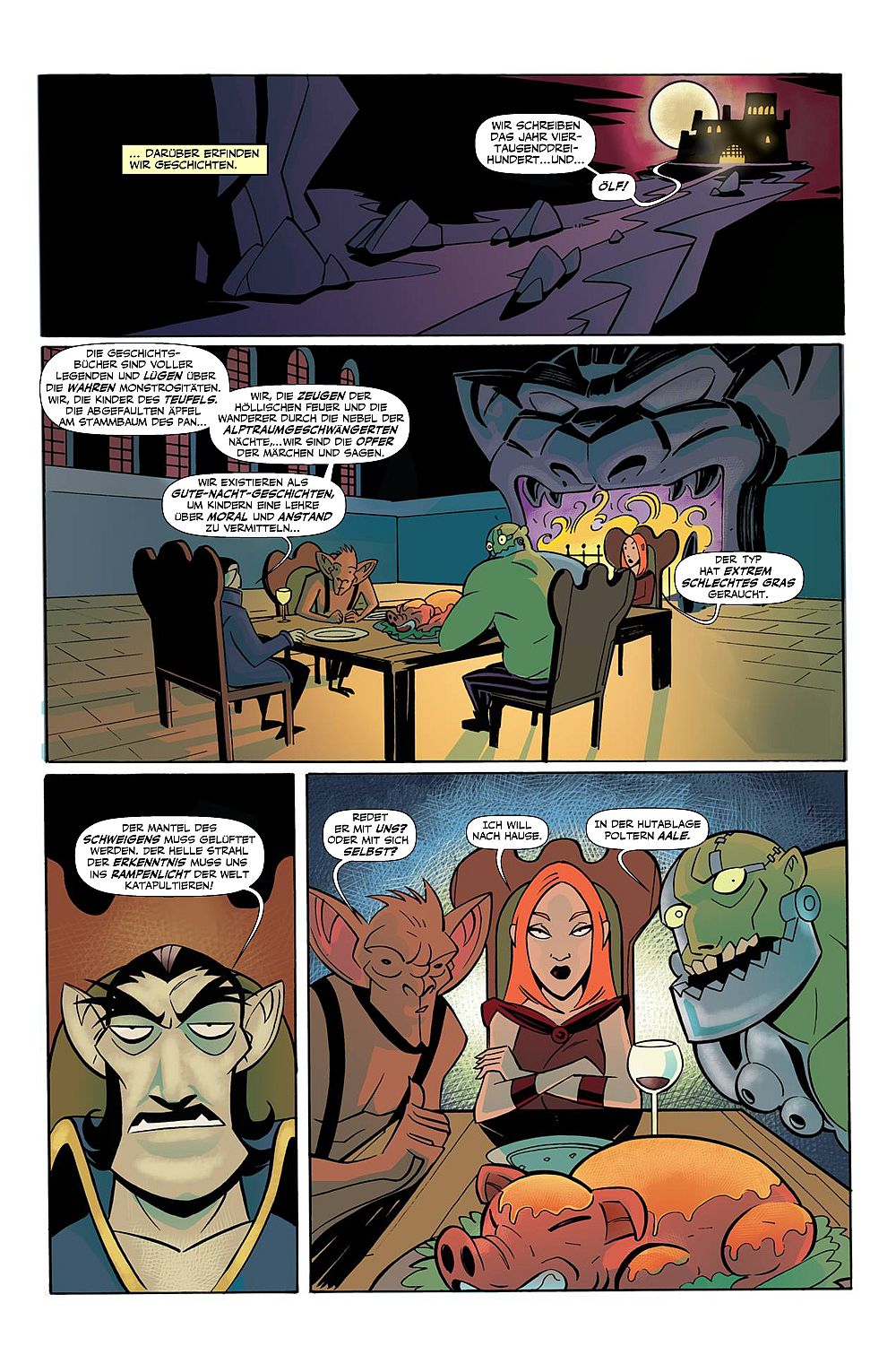 Ich habe dieses Heft blind gekauft und hatte keine Idee, worauf ich mich da eigentlich einlasse. Sehr positiv überrascht war ich dann doch, als ich bereits auf der dritten Seite gefallen an den Charakteren gefunden habe. Humor wird hier ganz groß geschrieben, gepaart mit Visionen einer glorreichen Zukunft für die sogenannte Ghoul Squad Truppe. Da wären Varney der die Ideen und Pläne schmiedet. Varney möchte nicht als Fußnote der Fantasie in den Annalen des Erdenrunds enden, er ist bereits über siebenhundert und ölf Jahre alt und er steht im Schatten seines damaligen Schülers Vlad Dracula. So kann das nicht weitergehen und er hat sich einen Vertreter jeder Zunft gerufen. Hellbat, ein Ausgestoßener aus der Gesellschaft, verbannt als Missgeburt, Lady Wicca, eine Hexe die Varney auf einer Internetseite, auf die wir hier nicht weiter eingehen wollen, kennengelernt hat und zuguterletzt den etwas unter bemittelten Grinderstein. Man kann Grinderstein ungefähr so beschreiben, wenn bei Ikea manchmal eine Schraube fehlt, dann fehlt bei Grinderstein ein ganzes Regal. Und da wäre noch der Vormieter, äh, ich wollte schreiben Vermieter Ratfink, der leichte Schwierigkeiten mit Varney in seinem Schloss bekommt. All das ist zu einer äußerst amüsanten Geschichte auf nur rund 24 Seiten in Farbe gezeichnet und geschrieben worden. Das Heft liest sich leicht und locker von der Hand, jedoch sollte der Leser sich auf viel Text einstellen. Als wäre eine Charakterbeschreibung im ersten Heft noch nicht genug, gibt es wahrlich noch eine Story. Bevor die eigentliche Geschichte auf Seite 10 ungefähr beginnt, habe ich mich bereits köstlich mit den Charakteren anfreunden und auch identifizieren können. Es gilt sich in einer Bar unter das allgemeine Volk zu mischen und möglichst wenig aufzufallen. Das dieses Unternehmen nicht ganz gut gehen wird, ist absehbar, doch mit einem Mord vor der Kneipe, scheinbar von einem Werwolf, hat niemand gerechnet. Die Dorfbewohner machen die illustre Ghoul Squad Truppe für das Auftauchen dieses Werwolfes verantwortlich und um die Gunst der Dorfgemeinschaft zu gewinnen, machen sie sich auf den Weg, den Werwolf zu besiegen. Leider scheint auch dieses Unterfangen nicht ganz nach Plan zu verlaufen …