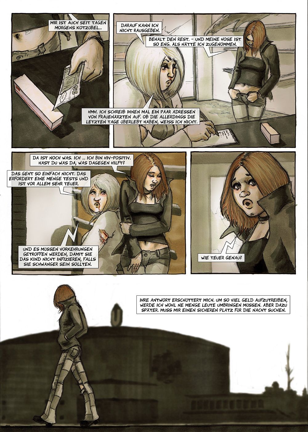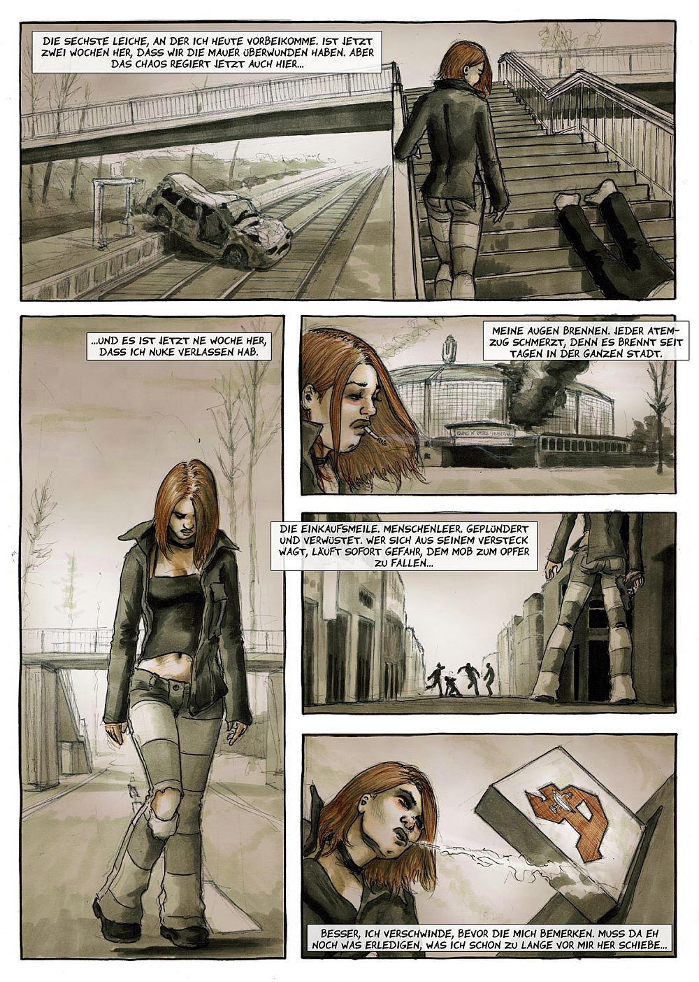 Michael Feldmann hat mit diesem Heft wieder beste Arbeit geleistet. In einer grauen und erdfarbenen Welt spielt diese Geschichte, in einer Stadt, die mich ein wenig an Dortmund erinnert. Warum ausgerechnet an Dortmund, es liegt einfach an dem U, welches der Leser im Original nahe des Dortmunder Hauptbahnhofs sehen kann. Ein weiteres Panel gibt mir das Gefühl, am Westfalen Stadion zu sein. Ob ich da richtig liege, dass weiß ich aber nicht so genau, vielleicht ist es auch unbeabsichtigt.