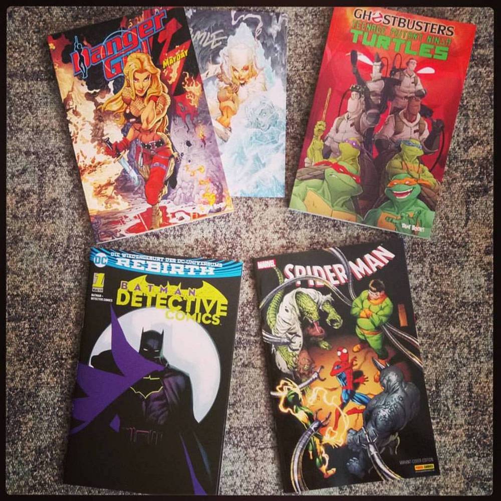 Danger Girl: Mayday (Special Edition), Ghostbusters/Teenage Mutant Ninja Turtles, Batman – Detective Comics Nr. 1 (Comicpark Variant) und Spider-Man Nr. 11 (Comicpark Variant).
