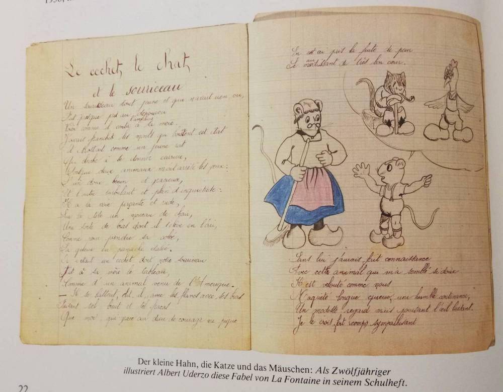 Uderzos illustrierte mit 12 die Fabel „Der kleine Hahn, die Katze und das Mäuschen“ von La Fontaine in seinem Schulheft.