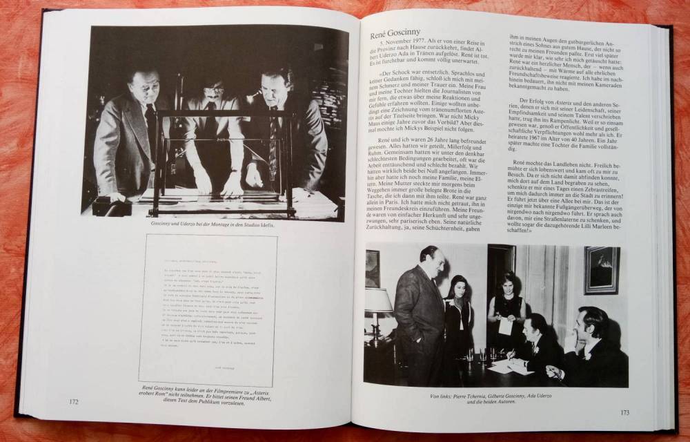 Rechte Seite: Uderzo erfährt vom Tod seines Freundes Goscinny Linke Seite: Goscinny bittet Uderzo den unten abgebildeten Text zur Premiere von Asterix erobert Rom vorzutragen, da er sich nicht gut fühlt.