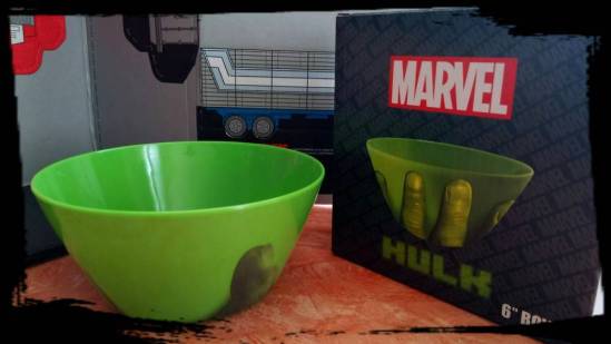 Für den Haushalt und täglichen Gebrauch, sofern man dies möchte, ist eine Müslischüssel im Hulk-Design enthalten. Die ca. 6 Zoll-Schüssel ist aus spülmaschinengeeignetem Plastik und mit Hulk seiner großen linken Hand bedruckt.
