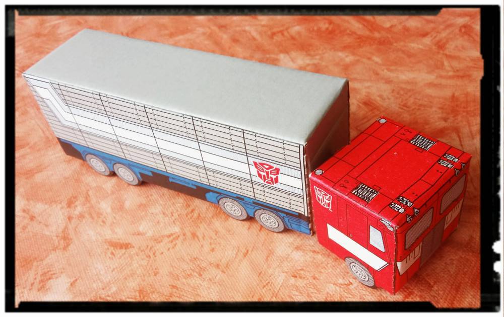 Bevor ich jetzt zu dem eigentlichen Grund für den Erwerb dieser Box komme. Zeige ich euch noch ein paar Fotos, des Optimus Prime, der sich auf der Innenseite der Box befand. Denn diese war bedruckt und vorgestanzt, sodass man sich seinen eigenen 80er Jahre-Optimus basteln konnte.