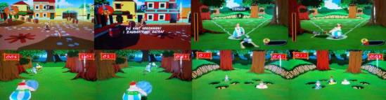 Die Aufgaben reichen dabei von einfachen Jump&Run-Levels, die es zu durchqueren gilt, bis zu den verschiedensten Minispielen, á la „Hau den Lukas“ oder „Weitwurf“. In den Jump&Run-Passagen muss man sich durch die unterschiedlichsten Landschaften kämpfen, Römer verhauen, Münzen und Zaubertrank einsammeln und am Ende manchmal auch gegen einen Endboss kämpfen, um letztendlich eine der gesuchten Zaubertrankzutaten zu erhalten. Sieben solcher „Level“ gibt es im ganzen Spiel und diese sind über ganz Gallien verteilt. Doch diese zu erreichen ist nicht ganz so einfach. Bevor man diese erreicht, muss man erst einmal den Weg dahin bahnen, indem man versucht Gallien zu erobern. Stück für Stück. Wenn die Eroberung nicht nur mit der einfachen Animation abgetan ist, kommen die Minispiele zu Einsatz. Mal muss man Gegner verhauen und ein besonderes Fass innerhalb einer bestimmten Zeit finden, dann wieder Römer mit einem runden Stein umkegeln, oder Römer möglichst weit werfen, wie beim Kugelstoßen. Aber auch aus Löchern im Boden auftauchende Römer bekommen mal einen Hinkelstein auf den Kopf, um Punkte zu sammeln.