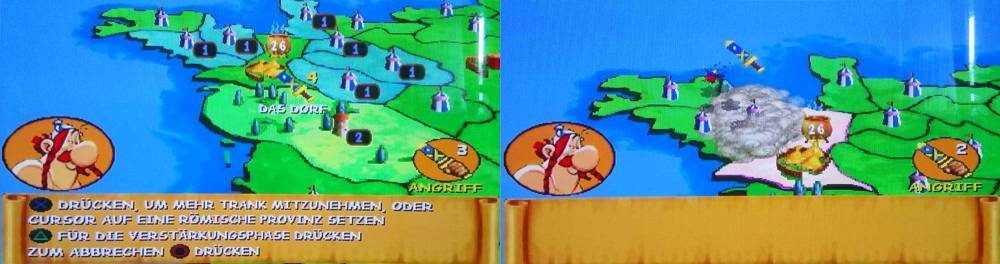 Die Aufgaben reichen dabei von einfachen Jump&Run-Levels, die es zu durchqueren gilt, bis zu den verschiedensten Minispielen, á la „Hau den Lukas“ oder „Weitwurf“. In den Jump&Run-Passagen muss man sich durch die unterschiedlichsten Landschaften kämpfen, Römer verhauen, Münzen und Zaubertrank einsammeln und am Ende manchmal auch gegen einen Endboss kämpfen, um letztendlich eine der gesuchten Zaubertrankzutaten zu erhalten. Sieben solcher „Level“ gibt es im ganzen Spiel und diese sind über ganz Gallien verteilt. Doch diese zu erreichen ist nicht ganz so einfach. Bevor man diese erreicht, muss man erst einmal den Weg dahin bahnen, indem man versucht Gallien zu erobern. Stück für Stück. Wenn die Eroberung nicht nur mit der einfachen Animation abgetan ist, kommen die Minispiele zu Einsatz. Mal muss man Gegner verhauen und ein besonderes Fass innerhalb einer bestimmten Zeit finden, dann wieder Römer mit einem runden Stein umkegeln, oder Römer möglichst weit werfen, wie beim Kugelstoßen. Aber auch aus Löchern im Boden auftauchende Römer bekommen mal einen Hinkelstein auf den Kopf, um Punkte zu sammeln.