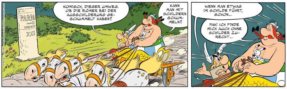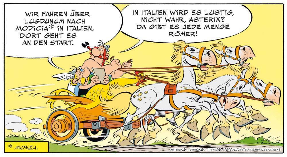 Inzwischen ist es schon wieder zwei Jahre her, dass der bisher letzte Band von Asterix und seinen Freunden erschien. Zwei Jahre, in denen sich auch das Team dahinter, der Autor Jean-Yves Ferri und Zeichner Didier Conrad weiterentwickeln konnten. Nach „Der Papyrus des Cäsar“ schicken sie die gallischen Helden erneut auf eine abenteuerliche Reise, die sie diesmal nach Italien führt. Nun wurde heute auf der Pressekonferenz im Automobile Club de France am 6 Place de la Concorde in Paris gegen 9 Uhr das Cover des neuesten Bandes, der am 19. Oktober 2017 weltweit erscheint dem anwesenden Publikum enthüllt.