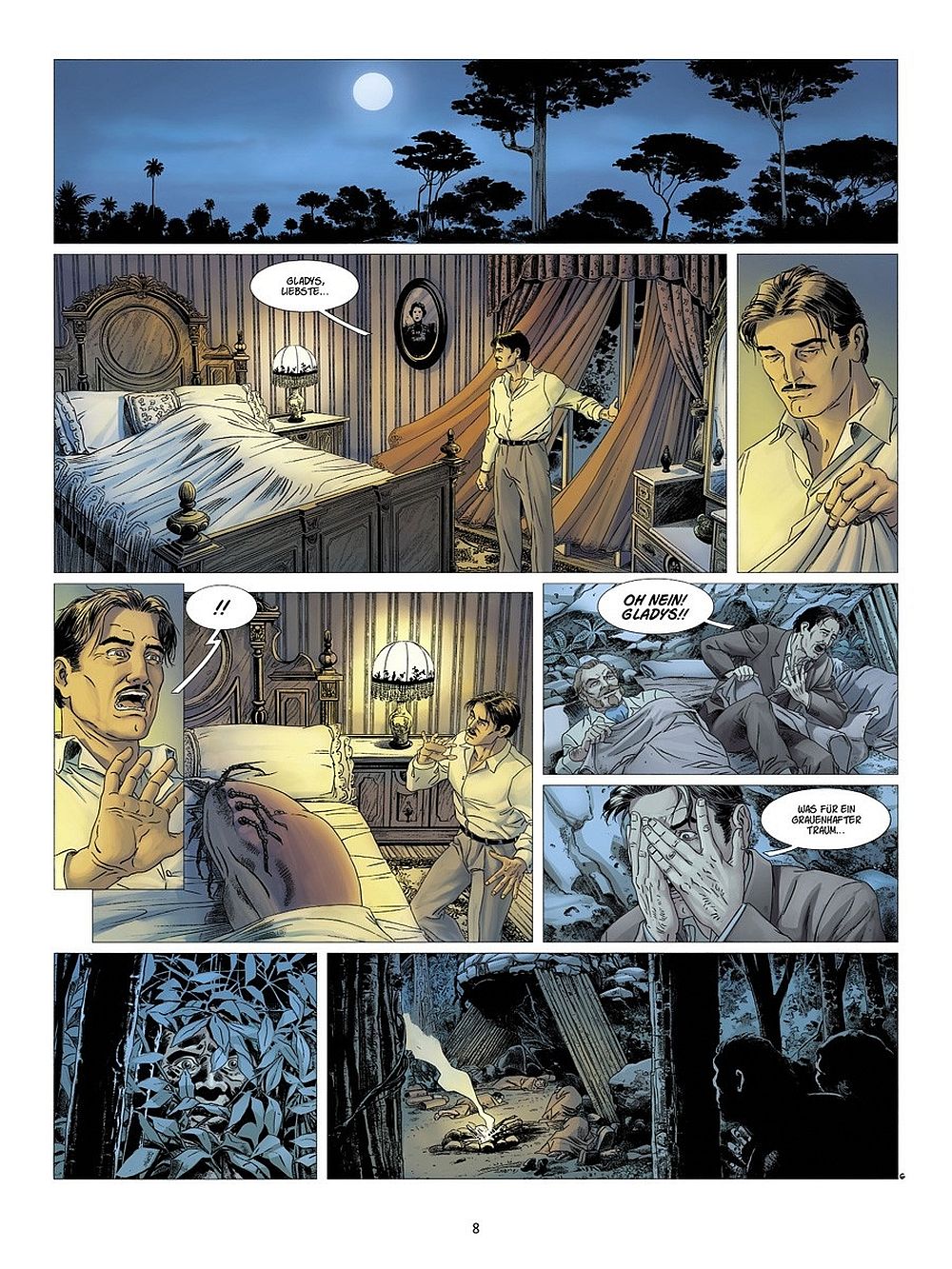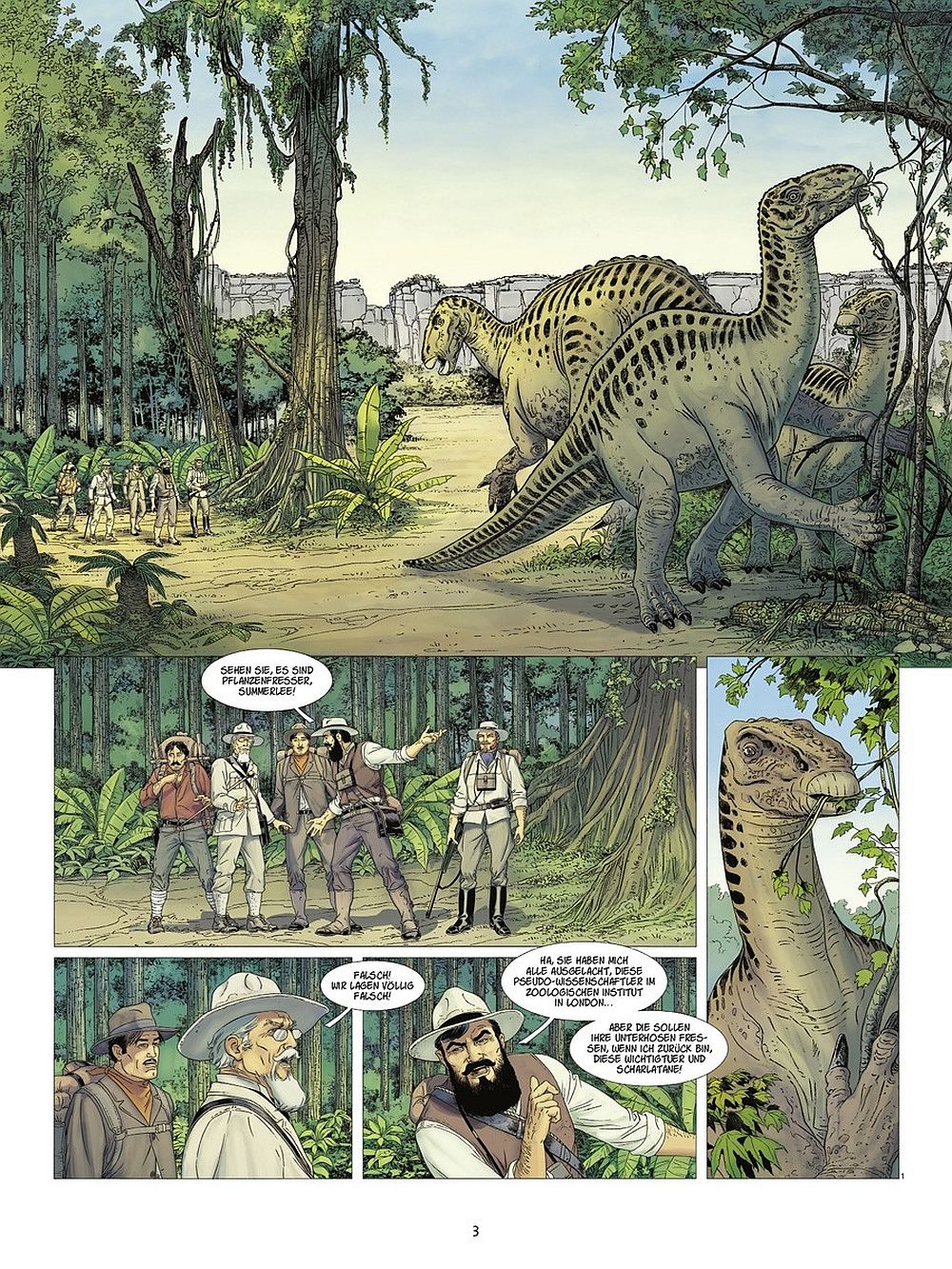 Mit Christophe Bec (Text), Fabrizo Faina & Mauro Salvatori (Zeichnungen) und Andrea Scoppetta (und Digikore Studios) in der Farbgebung wirkt dieses Album mehr als gelungen. Die Zeichnungen wirken wie aus einem Guss. Farbe und Text harmonisieren bei Tag und Nacht, Flora und Fauna wirkt ausgearbeitet, Landschaften und Charaktere sind klar und deutlich erkennbar. Sehr gut gefallen mir die Rückblenden in dunklen Grautönen, so kann der Leser umgehend nachvollziehen, dass dies eine Erinnerung ist. Ebenfalls etwas erleichtert bin ich darüber, dass die Geschichte sich nur auf die Vergessene Welt konzentriert, sie bleibt an diesem Ort und wechselt nicht nach London zurück. So können sich Intensivität und Atmosphäre dieses Ortes uneingeschränkt auf die Leser übertragen, ohne dass sie von der Handlung raus gezogen werden und in London bei der Teilnahme an einem wissenschaftlichen Kongress erwachen.