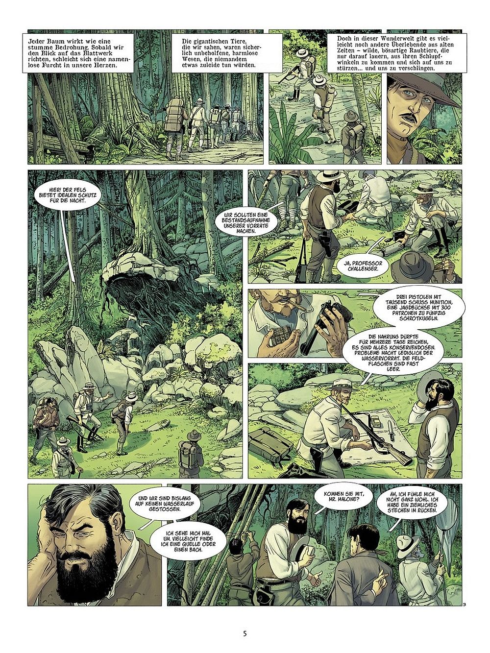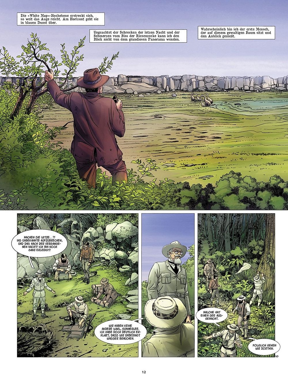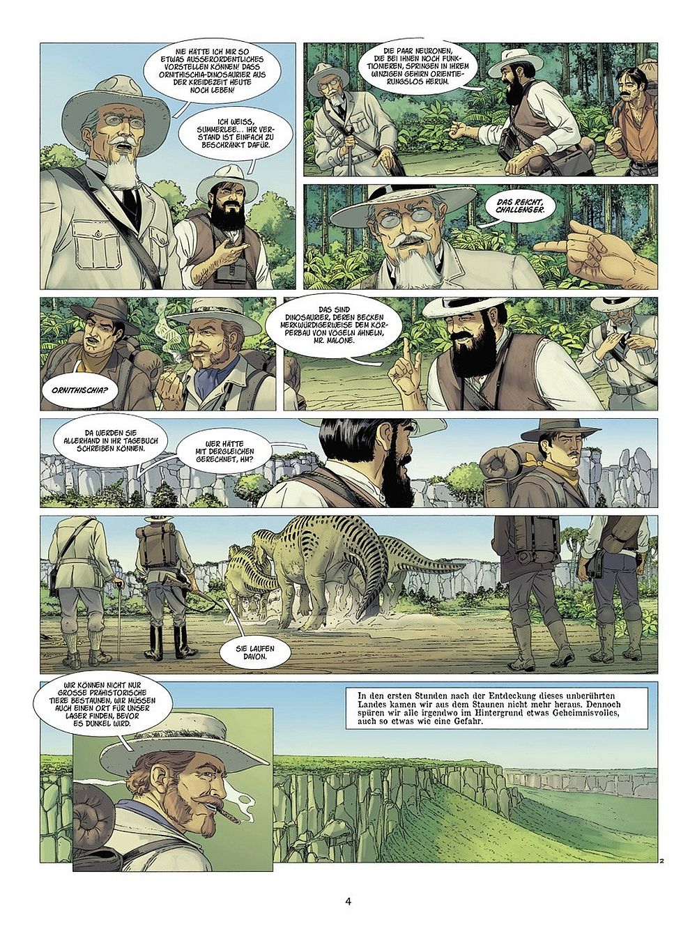 Nachdem im ersten Band die Protagonisten und deren Beweggründe an der Expedition teilzunehmen dem Leser vorgestellt worden sind, befasst sich dieser Band nur mit kleinen Ausnahmen (Hintergrundinformationen zu Ned Malone und seiner Freundin) damit, weitere Informationen dem Leser an die Hand zu geben. Das Professor Summerlee und Professor Challenger sich nicht immer einig sind, wird im ersten Band ausreichend thematisiert und dies bleibt weiterhin auch deutlich für den Leser spürbar. Die Spannungen der unterschiedlichen Protagonisten ist während der gesamten Lektüre dieses Bandes spürbar, das macht den Band ebenfalls spannend und geheimnisvoll, vielleicht verbirgt uns einer der Expeditionsteilnehmer ja doch noch ein größeres Geheimnis? Ich könnte mir vorstellen, dass der dritte Band noch ein paar Überraschungen bereithält. Dieser Band konzentriert sich auf die Gemeinschaft, nicht jedoch so sehr auf die Individuen und ihre persönlichen Beweggründe, sondern eher auf die ungleiche Truppe im Gesamten. Gemeinsam haben sie ein Ziel vor Augen, sie wollen die Vergessene Welt erkunden und der Welt (insbesondere der Fachwelt und den Wissenschaftlern) beweisen, dass es auch heute noch Dinosaurier gibt, die überlebt haben! Dieser Band konzentriert sich auf das Vorankommen, das langsam und behutsame Erkunden einer fremden Welt. Dabei entsteht eine Intensivität, die spürbar wird, denn je länger scheinbar alles gut geht, desto eher könnte doch mal ein Dinosaurier auftauchen!