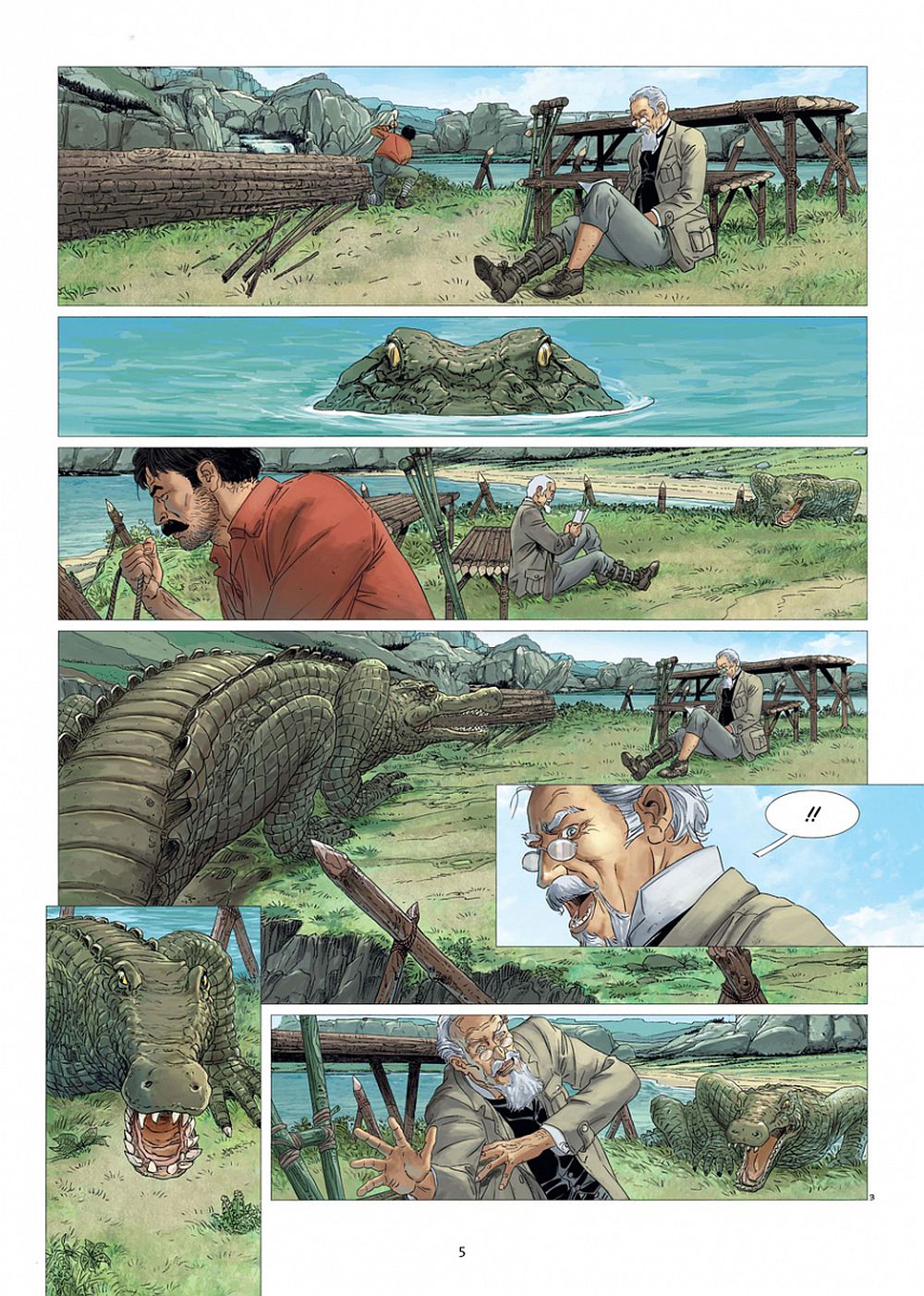 Auf all diese Fragen findet der Leser in diesem Band eine plausible Antwort. Nachdem sich im zweiten Band die Gruppe um Professor Summerlee und Professor Challenger einander getrennt haben, müssen sie sich erst einmal der anstehenden Gefahr bewusst werden, ehe sie sich einander wiedertreffen können. Das es dabei spannend, an einer Stelle auch brutal (eine Frau wird erschlagen und gegessen!) und atmosphärisch intensiv für den Leser einhergeht, mag man so zwar erahnt haben, doch die Ereignisse nehmen ihren Lauf und der Leser wird einfach mitgerissen. Schnell wird deutlich, dass Leben retten in dieser gefährlichen Vergessenen Welt gar nicht so einfach ist, denn nicht nur die Urzeitwesen stellen eine bedrohliche Gefahr dar. Die wissenschaftliche Gemeinschaft findet Unterschlupf bei den Indios, die sich Accala nennen. Dort lernen sie die Lebensweise dieses einfachen Volkes kennen. Es kristallisiert sich heraus, dass bereits seit Generationen ein Konflikt zwischen den Accala und den Affenmenschen besteht. Die Autoren und Zeichner beziehen sich auf Schlüsselereignisse der ersten beiden Bände und verknüpfen diese in diesem Band zu einer homogenen Storyline. So wird deutlich, dass bereits vor Professor Summerlee und Professor Challenger Menschen an diesem Ort gewesen sind.