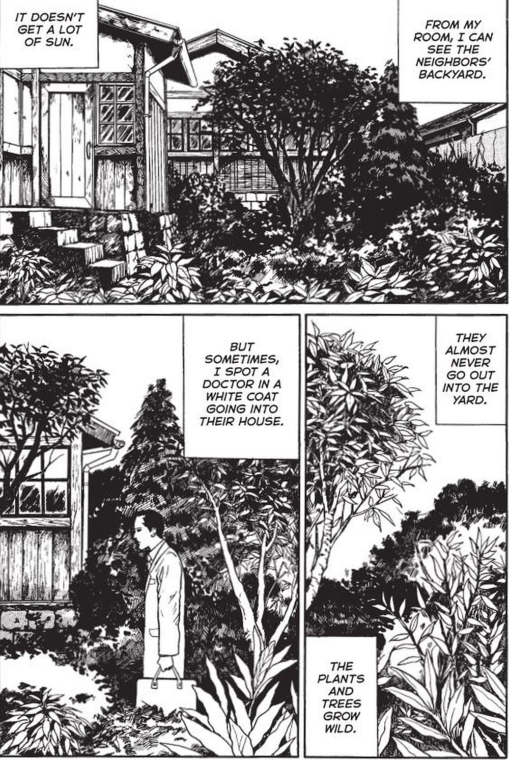 Auf der nächsten Seite fängt die Geschichte jedoch in ruhigen und schönen Zeichnungen an. Ein Doktor geht zum Nachbarhaus. Es ertönen Schreie eines Kindes aus diesem Haus. Ein Junge lauscht dem Geschehen, bis der Doktor das Nachbarhaus wieder verlässt. Dann sieht der Leser erstmalig das junge Mädchen mit den Löchern an den Armen. Scheinbar hat das Mädchen eine sehr seltene Erkrankung. Was hat es mit den Löchern an den Armen nur auf sich? In einer kurzen Rückblende wird dem Leser sehr schnell klar, dass Juji sein Opa ebenfalls diese seltsame Löcherkrankheit am ganzen Körper hatte und letztendlich daran auf grausame Art und Weise verstorben ist. Juji und sein Freund Hideo wollen der Sache mit dem Nachbar Mädchen auf den Grund gehen. Sie beginnen nachzuforschen, ob es eine Verbindung zwischen dem Tod von Juji seinem Opa und der Erkrankung des Mädchens gibt. Dabei kommen sie dem Geheimnis eines scheinbar geschnitzten Jade Käfers sehr nahe. Hat die unheimliche Erkrankung etwa mit diesem Jade Käfer zu tun? Als dann plötzlich eines Tages das Mädchen aus dem Nachbarhaus keine Löcher mehr an ihrem Körper aufweist, wird die Sache ernst, denn der Doktor scheint ebenfalls ein Geheimnis zu haben. Wer klopft den plötzlich so spät an einem stürmischen Abend an die Tür, das kann doch nicht etwa Hideo sein …