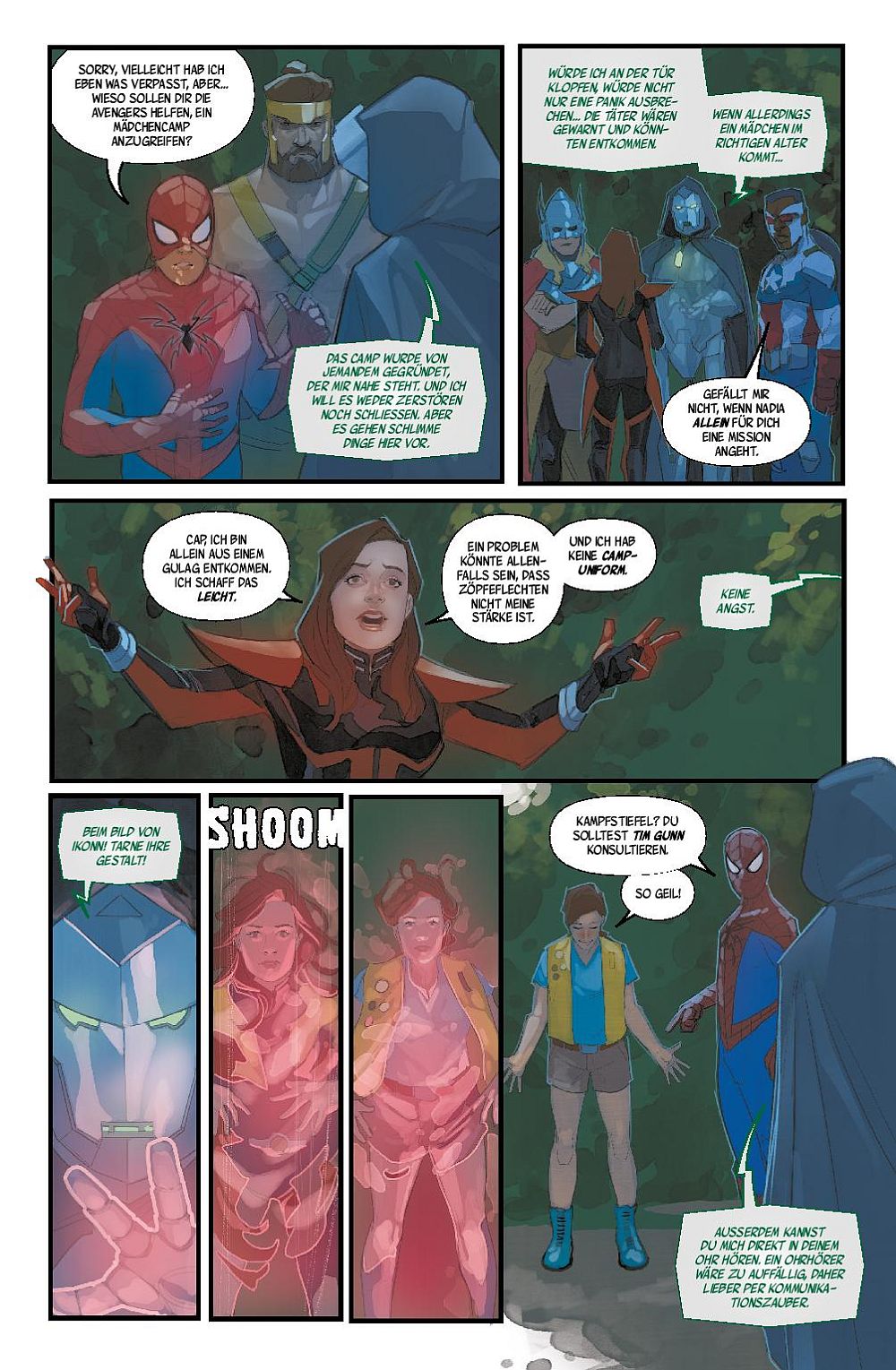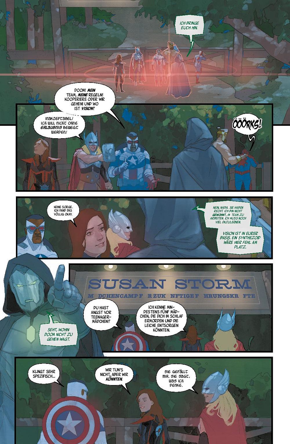 Am Baxter Building kämpfen die Avengers gegen ein großes vielmäuliges Ungetüm, doch dann taucht der neue Iron Man Dr. Victor von Doom auf. Es kommt zu einem interessanten Gespräch zwischen Doom und den Avengers. Der Leser bemerkt sofort, dass sich Wasp scheinbar sehr für Doom begeistert. Es hat den Anschein, das Wasp sich stark hingezogen fühlt zu Doom. Na vielleicht erfahren wir in den kommenden Heften noch eine Romanze zwischen Doom und Wasp, wer mag das schon erahnen? Dr. Doom benötigt für sein Problem jedoch die Unterstützung der Avengers. Dieses Problem befindet sich scheinbar in einem Mädchencamp für angehende Führungskräfte. Als Campmitglied verkleidet, erhält Wasp den Auftrag herauszufinden, was genau die Probleme im Mädchencamp sind. So kommt es, dass Wasp an einem Ritualmord geopfert werden soll. Die Avengers greifen ein, und bekommen es mit jungen Mädchen und einem Monster zu tun. Der Kampf scheint schwierig zu sein, will man die jungen Mädchen auch nicht lebensgefährlich verletzen. Das hier dämonische Magie im Spiel ist, steht außer Frage, aber ob jemand heute sterben muss, das entscheiden die Avengers ganz allein!