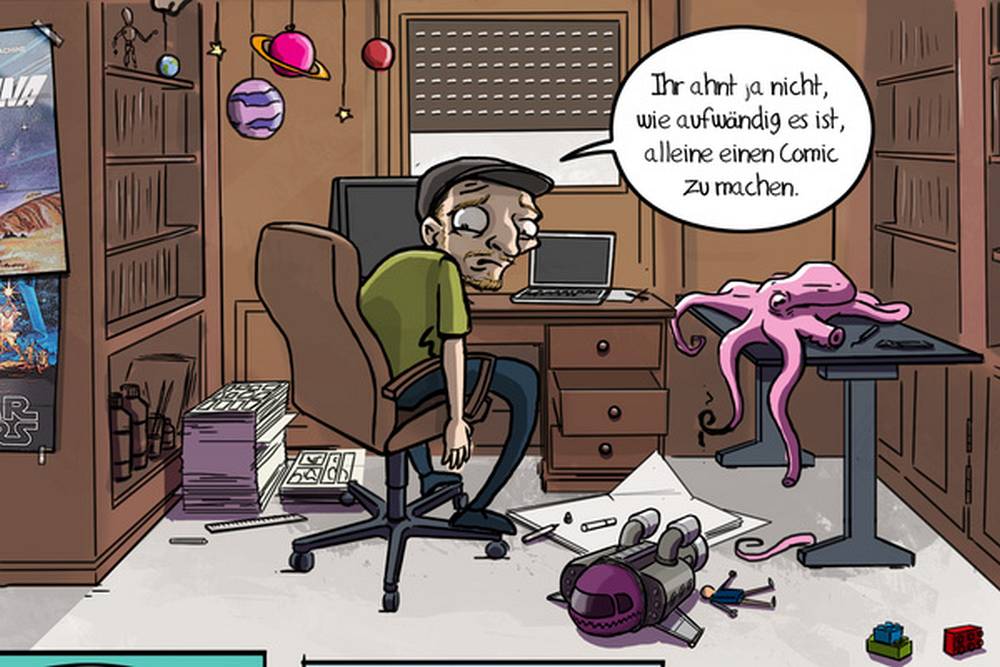 Jau, also wie du schon gesagt hast, hab ich die „Bountilus“ und Captain Nihil nach einer Idee von Andy entworfen, um einen Weltraum-Abenteuer-Comic zu machen. Wir haben noch 2-3 Ideen auf dem Tisch. Aber jetzt erstmal diese hier 😉 . Bevor wir uns so richtig in die Hauptstory des ganzen schmeißen konnten, hatte ich schon so Bock anzufangen, dass ich noch den kleinen Quattro als Sidekick und die Story über deren Kennenlernen geschrieben und illustriert habe. Da die Veröffentlichung des kompletten Abenteuers noch etwas dauert (wir sind gerade bei Seite 100 und Nichtmal bei der Hälfte) und ich mal wieder was Neues rausbringen wollte, habe ich noch diesen Zwischenteil mit mir reingepackt. Fand ich lustig und kam gut an. Daraus ist jetzt dieser erste Band geworden. Find ich auch einen guten Teaser für das ganze Projekt.Mueli77: