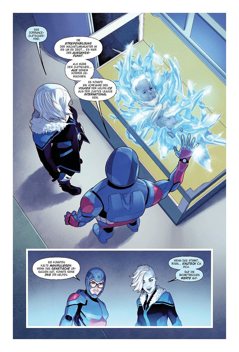 Nicht nur in der ersten Story dieser Ausgabe versucht Caitlin Snow alias Frost ihrer Erkrankung (um zu überleben muss Frost die Lebensenergie anderer Menschen aufsaugen) mit der Hilfe weiterer Teammitglieder auf die Spur zu kommen. Dabei werden alle möglichen Ideen in Betracht gezogen und näher untersucht. Ob Caitlin es bald schafft, sich von ihrer Erkrankung zu heilen, das steht noch in den Sternen. Snow und Atom sind im Museum für unnatürliche Geschichte und untersuchen das Dorrance Gletscher Kind. Dabei bekommen sie es mit unerbetenen Gästen zu tun. Die Zeichnungen und die Farben dieser ersten Story gefallen mir richtig gut, denn sie heben sich qualitativ von den weiteren Storys ab. Hier gibt es klare und etwas detaillierte Zeichnungen mit harmonischen Farben zu betrachten, welche auch in den Kampfszenen gekonnt zur Geltung kommen. Die weiteren Geschichten haben eher den typisch amerikanisch einheitlichen Helden Kampf Zeichenstil, welcher sich nicht großartig hervorhebt. Das finde ich etwas schade, denn wären alle Storys auf diesem zeichnerischen Niveau, so hätte ich mit hoher Wahrscheinlichkeit mehr Freude an dieser Ausgabe.