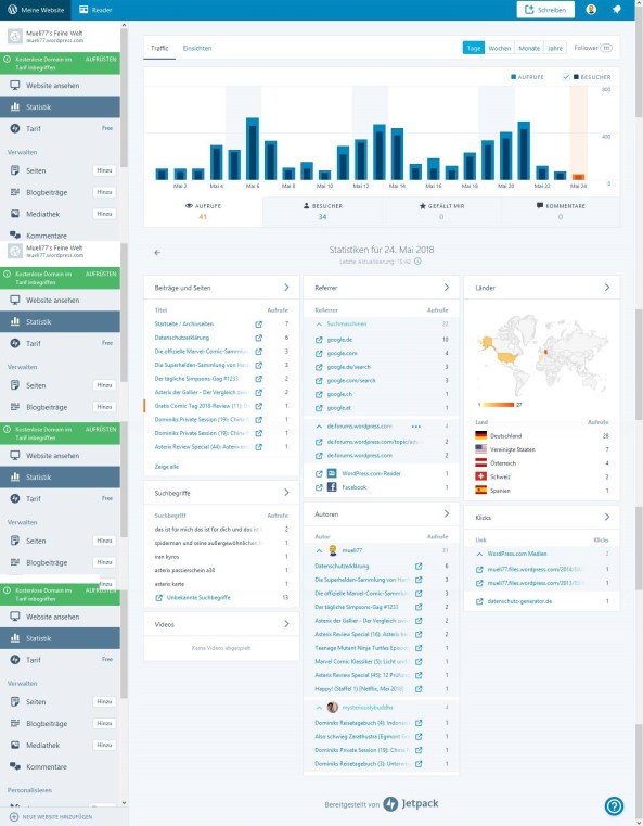 Ich versuche nun einmal diese neue Verordnung so einfach wie möglich zu erklären, ohne dabei auf verschiedene einzelne Artikel der 99 Artikel umfassenden Verordnung direkt einzugehen. Im Grunde soll die neue Verordnung den Verbraucher vor dem Missbrauch eigener personenbezogener Daten schützen. Damit sind vor allem Daten gemeint, die Rückschlüsse auf eine menschliche Person zulassen, egal ob lebendig, oder bereits verstorben. Hiermit sind vor allem natürliche Personen (Wiki-Link) im rechtlichen Sinne gemeint, im Gegensatz zu juristischen Personen (Wiki-Link). Diese Daten umfassen alles, was Rückschlüsse auf diese Person zulässt, wie E-Mail-Adresse, Name, Anschrift, IP-Adresse, Telefonnummer, Geburtsdatum, uvm. Die Liste ist relativ lang und deshalb beginnen hier die ersten Probleme. Als Beispiel möchte ich hier nun einmal meinen Blog aufführen. Jeder, der diesen Blog aufruft, wird durch das Statistiktool Jetpack, von WordPress erfasst. Dabei werden die Herkunft, und welche Artikel aufgerufen werden dokumentiert, genauso wie die Info von woher sie auf diesen Blog aufmerksam werden. Sei es Google, Facebook, Twitter, diverse E-Mail-Progamme, usw. oder von mir verbreitete Links in diversen Netzwerken. Auch wird vermerkt, wenn man diesen Blog über einen von mir generierten Link, wie zum Beispiel die Amazon-Affliate-Links, oder einen anderen Weblink, zum Beispiel zu einem Shop oder Ähnlichem, verlässt. Was dabei nicht vermerkt wird, ist, wer das wann und wie macht. Sprich, ich selbst habe keinen Einblick, ob ein Max Mustermann aus Buxtehude um 13:57 Uhr über Facebook ein Asterix Review Special aufruft und danach über einen Amazonlink meinen Blog verlässt. Alles, was ich erfahre, ist, dass irgendjemand von Facebook auf meinen Blog kam. Was er dort angesehen hat, sehe ich nicht sofort, und ob es der gleiche ist, der dann über Amazon rausgegangen ist, sehe ich auch nicht. Denn dieser Verlauf ist mir selbst unbekannt und wird am Ende des Tages nur in einer Gesamtstatistik erfasst, wie ihr sie auf dem Screenshot von heute seht.