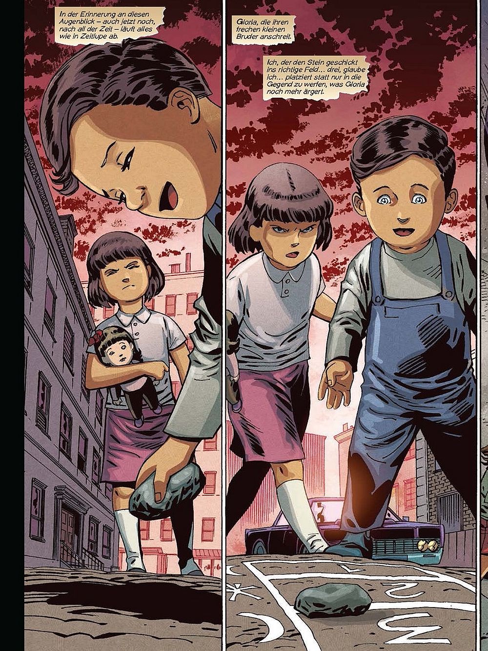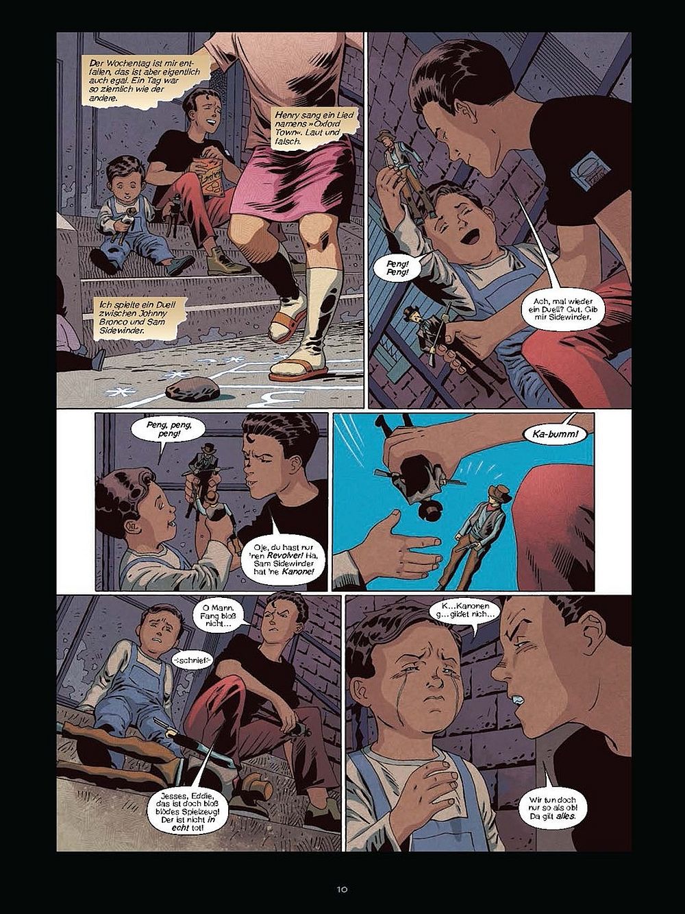 Auf intensive Art und Weise erfährt der Leser intime und prägende Einblicke in die Familienangelegenheiten von Eddie Dean. Sein Bruder Henry Dean verübt einen eher schlechten Umgang, denn mit zusehendem Alter nimmt die Drogenproblematik ihren Lauf und hält auch vor Eddie Dean nicht mehr zurück. Bis dahin gibt es jedoch einen sehr schockierenden Moment in Eddie seiner Kindheit, denn der Autounfall seiner Schwester ist zeichnerisch, erzählerisch und dramaturgisch einfach grandios umgesetzt worden. Das ist ganz großes Kino, was hier an Intensivität auf den Leser einprasselt. Der zeichnerische Perspektivenwechsel in Nahaufnahme ist verwirrend und etwas verstörend zugleich. So erfährt der Leser nach und nach wichtige Episoden aus Eddie Dean seinem Leben, Episoden, die ihn stark geprägt und beeinflusst haben. Wie ist er zum Drogendealer geworden, was hat er mit seiner Familie alles erlebt. Das alles ist durchgehend intensiv erzählt, was den Band unwiderstehlich macht aus den Händen zu legen.