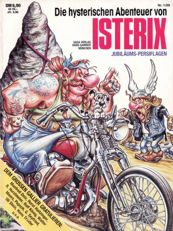 „Die hysterischen Abenteuer von Isterix“ erschien 1989 zum 30. Geburtstag von Asterix beim Saga Verlag von Hans Gamber in Deutschland. Dieser veröffentlichte zu jener Zeit bereits andere Parodien und Persiflagen, wie zum Beispiel: „Playbock“, „Dr. Spiegel“, „Tunte“, „Cosmopuritan“ oder auch „Parody R. Hodan“. Man könnte also sagen, dass Hans Gamber einiges an Erfahrung mit solchen „Veröffentlichungen“ vorweisen konnte. Doch was sich dann um diesen eigentlich als eine Art Danksagung, Hommage, Persiflage entwickelte, konnte selbst er nicht vorhersehen. Immerhin bediente sich Gamber einer bereits zuvor in Frankreich unter dem Titel „Les invraisemblables aventures d’Istérix“ veröffentlichten Sammlung. Und so kam das Album, angereichert mit Arbeiten einiger namhafter deutscher Comickünstler und einer Auflage von 150.000 Exemplaren in den Handel, wovon bis zu Prozessbeginn auch etwa 60.000 Exemplare verkauft wurden.
