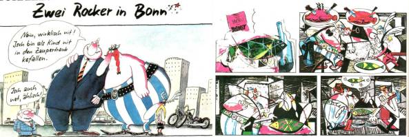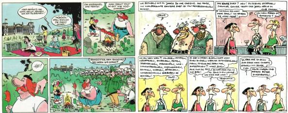 Schon die Liste der beteiligten Künstler zeigt, dass sich Hans Gamber nicht hat lumpen lassen, um die deutsche Ausgabe noch ein Stück weit besser zu machen. So liest man neben bekannten Namen wie Coyote, Tournaire, Chanteloup, Didier Ray und Mysius auch deutsche Größen wie Manfred Deix, Horst Haitzinger, Walter Moers, Barbara Hömberg, Detlef Surrey, Burkhard Fritsche, Berti Henning, Ralf König, Hans Kiefersauer, Gerhard Seyfried, Rainer Schwarz, Peter Fuchs, Rudi Hurzlmair und Uli Stein.