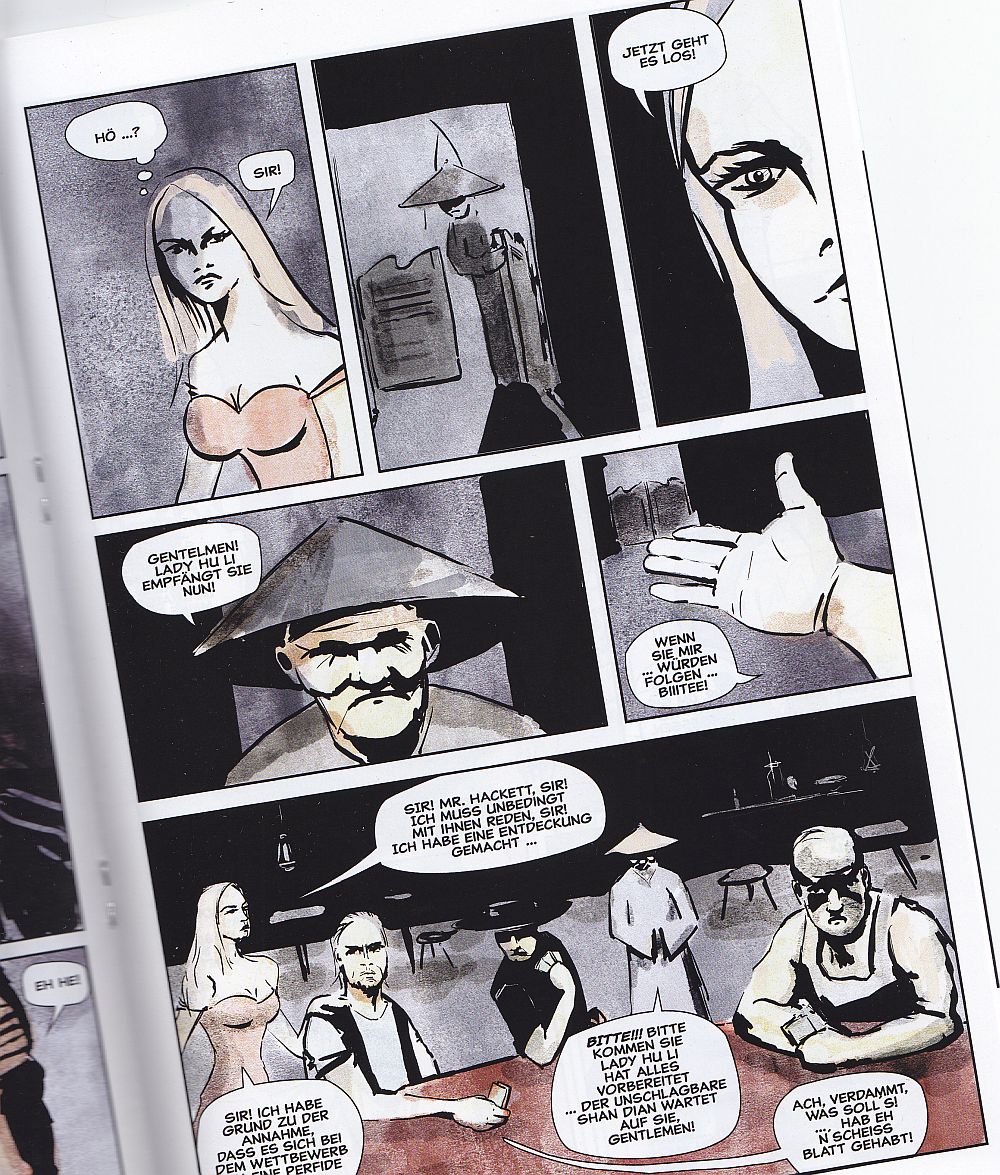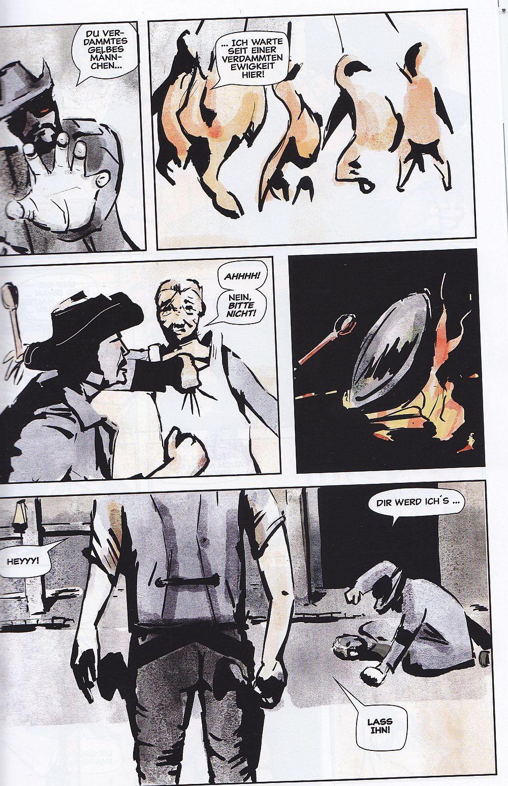 Der chinesische Circus ist dagegen etwas abgefahren, denn plötzlich tauchen Drachen in der Wüste auf. Damit habe ich definitiv nicht gerechnet, aber die Story schafft es irgendwie, den Leser weiterhin zu unterhalten und zeitgleich zu faszinieren auf nur 24 Seiten. Hinzu kommen die interessanten Farben und die eigenartigen Zeichnungen, die ein trockenes leicht räudiges Wüstenflair präsentieren. Die Zeichnungen sind einfach gehalten, oftmals auf einem detailarmen Hintergrund gelegt. Dennoch versprühen diese ein eigenwilliges Flair, welches fasziniert. Die Farben sind kräftig und trocken, erinnern mich etwas an Wachsmaler Stifte. Alles zusammen ergibt ein einzigartiges Wüstenerlebnis mit einem kleinen aber gefährlichen Ritual im abgefahrenen chinesischen Circus. Hier treffen der trockene Wüstenstaub und die Kopfgeldjäger auf asiatische Drachen im Circus, welche die Fantasie des Lesers beflügeln …